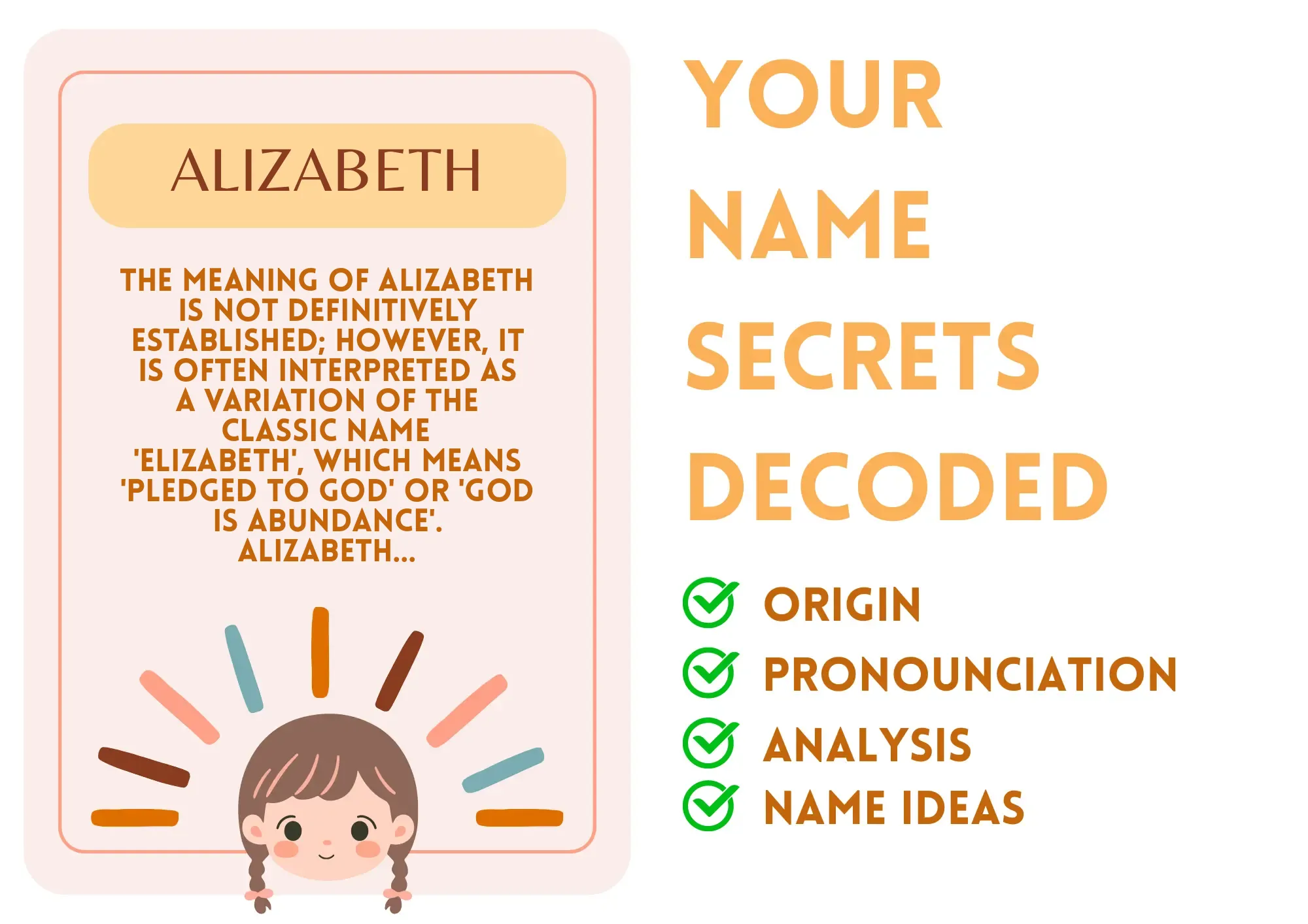 Alizabeth is a unique and elegant name with a blend of classic and modern elements. It carries a sense of grace and sophistication, making it a charming choice for baby girls. While its exact origin and meaning may vary, Alizabeth exudes a sense of beauty and individuality.