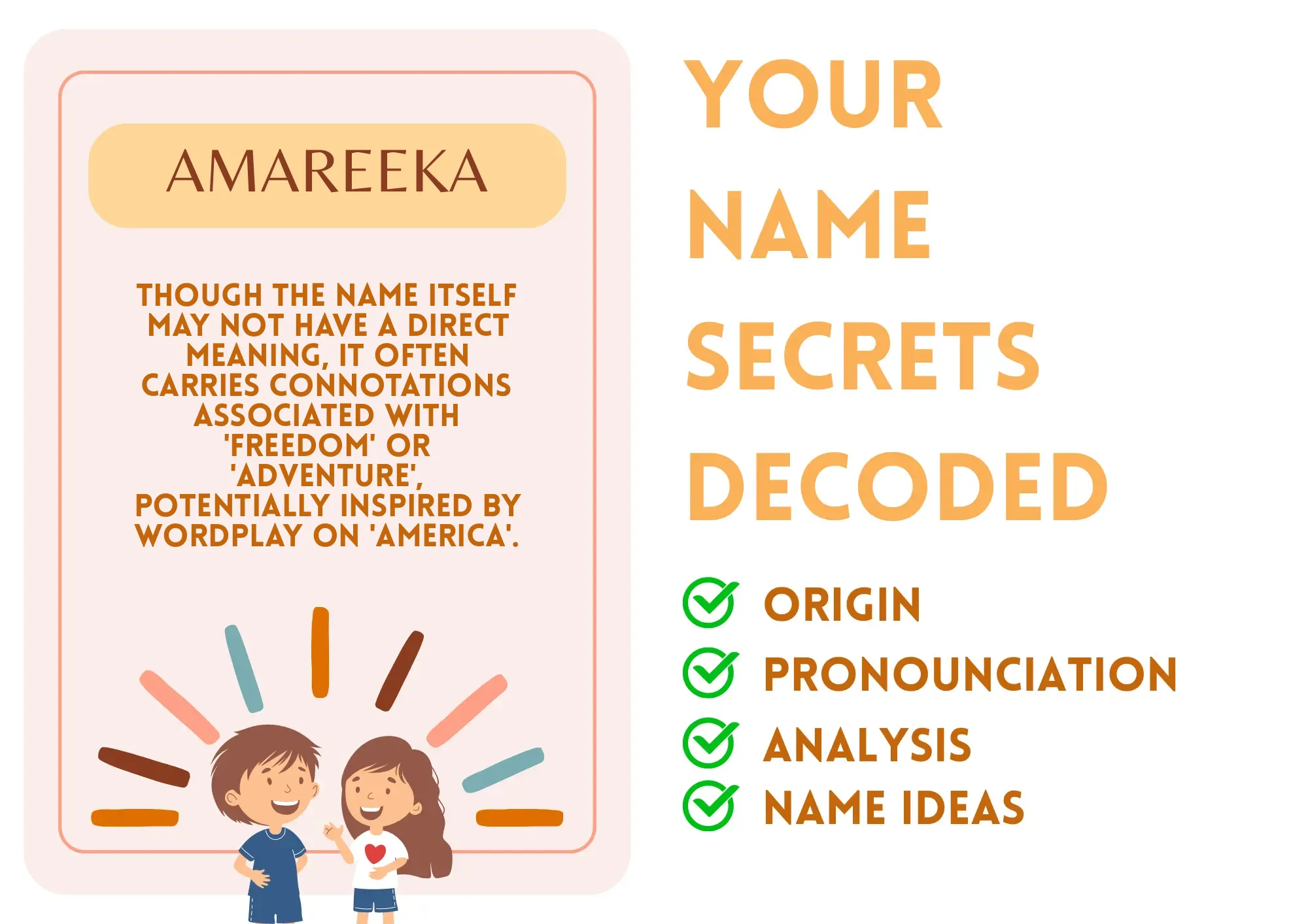 Amareeka is easy to write and call, bearing a modern tone that resonates with a sense of courage and adventure. The name has few common typos and lends itself to various playful nicknames, like Amy or Rika.