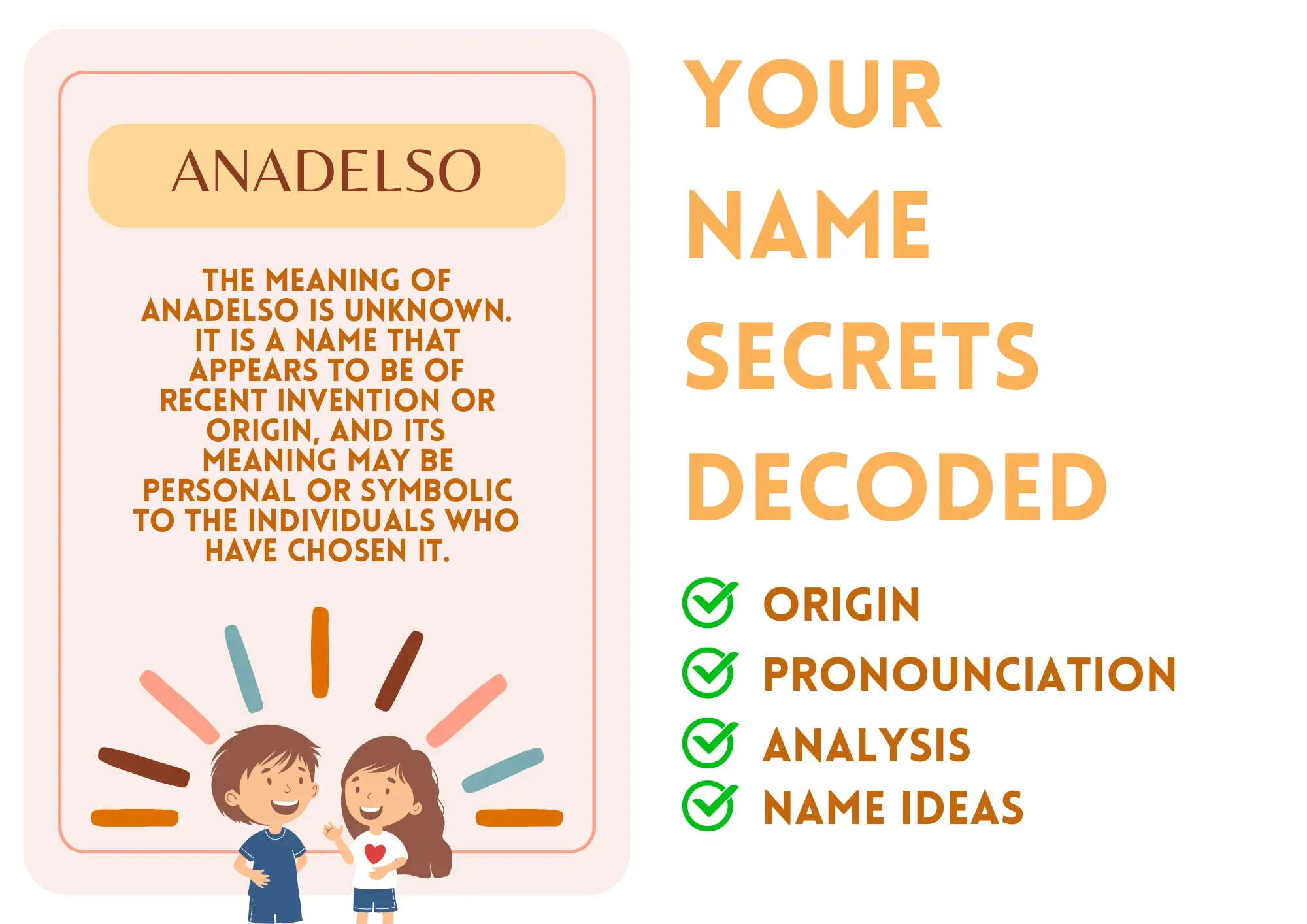 Meaning: The meaning of Anadelso is unknown. It is a name that appears to be of recent invention or origin, and its meaning may be personal or symbolic to the individuals who have chosen it.