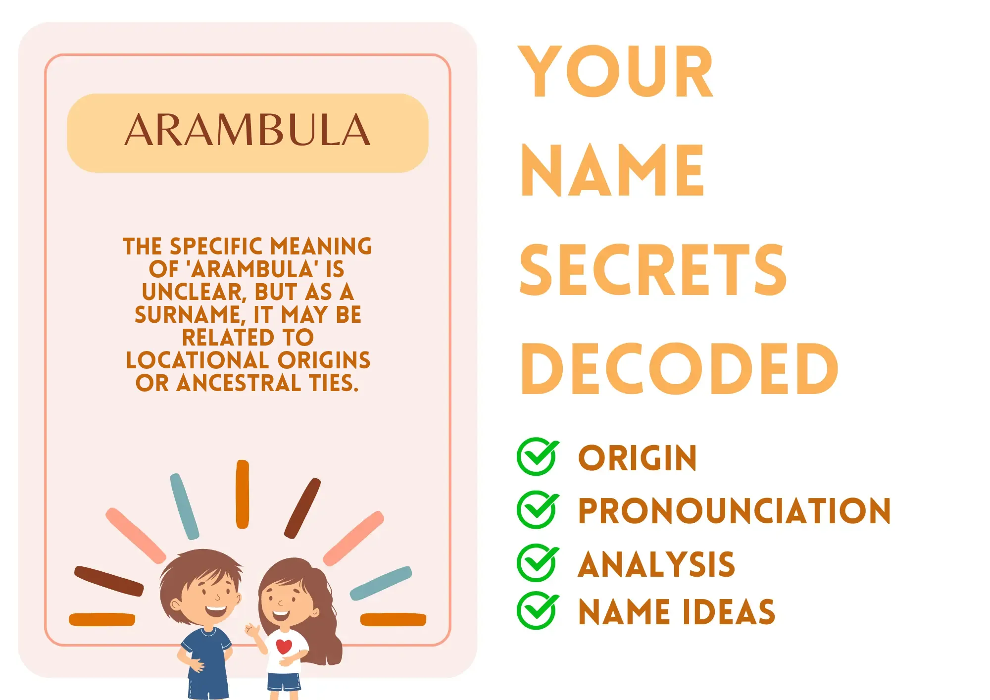Meaning: The specific meaning of 'Arambula' is unclear, but as a surname, it may be related to locational origins or ancestral ties.