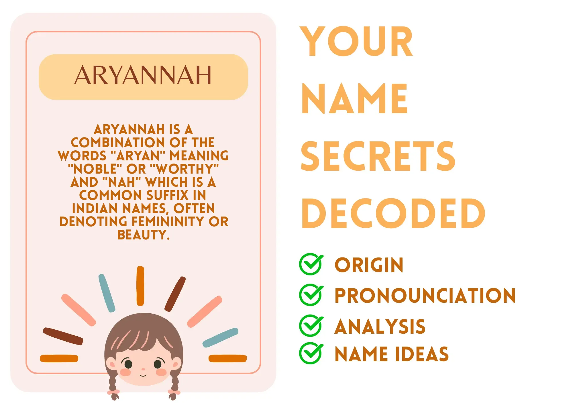 Meaning: Aryannah is a combination of the words "Aryan" meaning "noble" or "worthy" and "nah" which is a common suffix in Indian names, often denoting femininity or beauty.