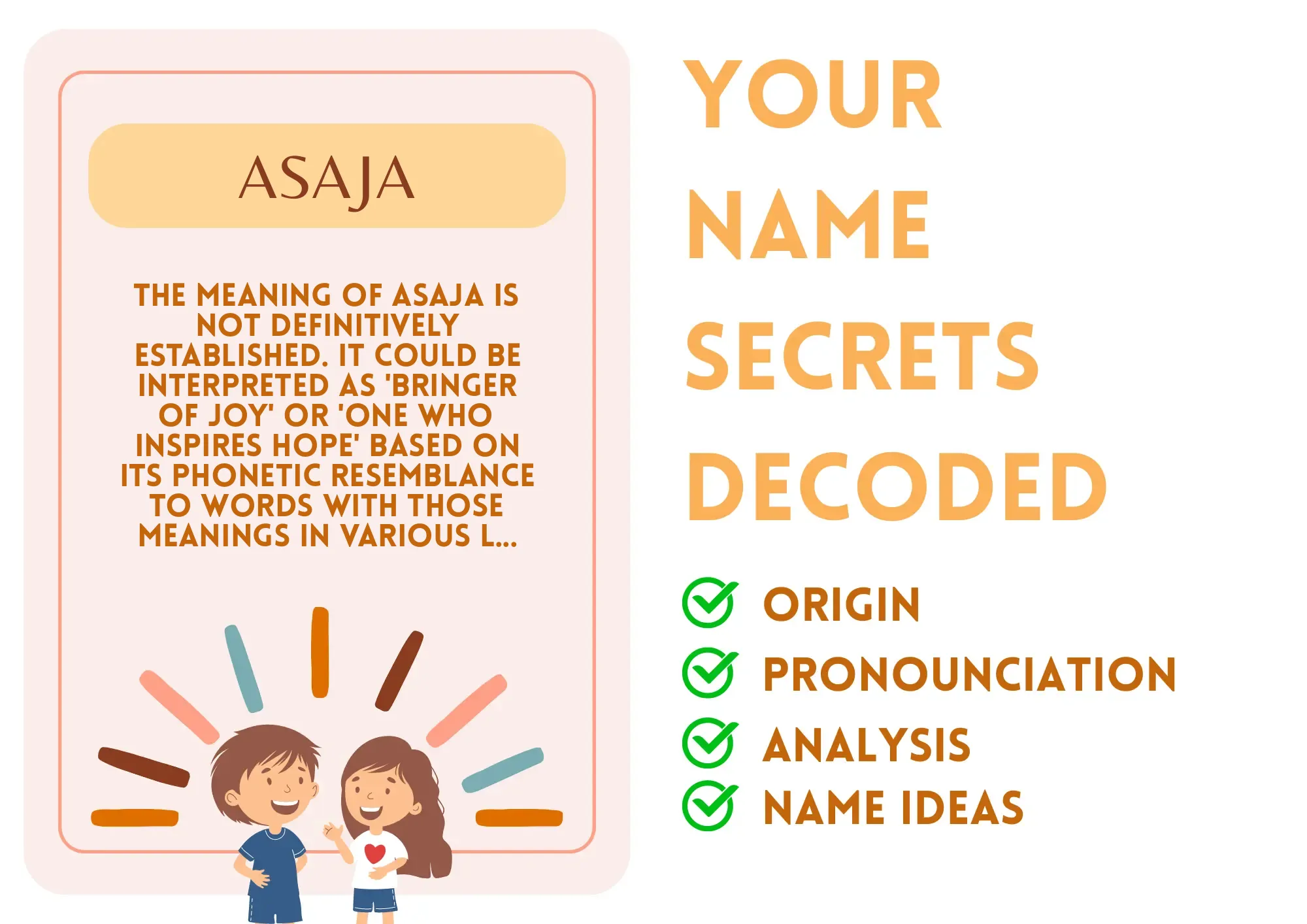 Imagine being a spark of sunshine on a cloudy day, a person whose presence lights up the room! Asaja is that friend who brings a contagious energy, making each moment feel a bit more special. This unique name isn't just a word; it's like a fun flavor of ice cream that’s not too common, but when you try it, it just hits the spot! It carries a vibe of happiness and positivity that can inspire those around them, making life a little bit brighter.