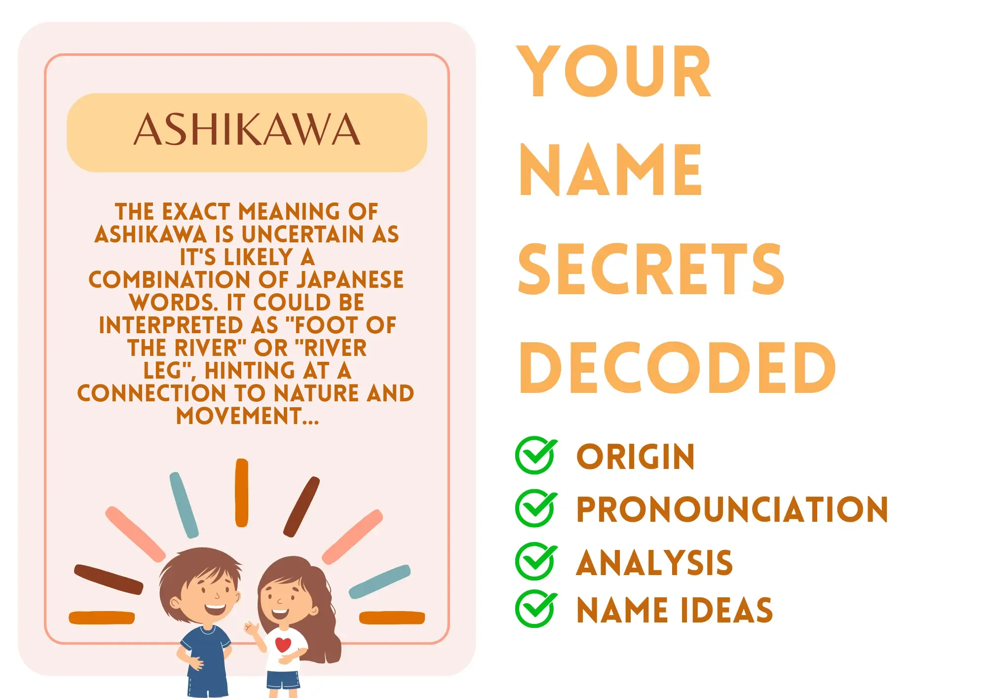 Think of Ashikawa as the "foot of the river." This not-so-common name may suggest a wonderful connection to nature. Just as a river takes its time flowing, Ashikawa moves through life with purpose and deliberation. They are grounded and adaptable, perfectly in tune with their surroundings. When faced with challenges, imagine them stepping into a stream, fully immersed in the experience and ready to face whatever comes their way. This connection fuels their ability to stay calm in chaos, making them seem like the ultimate life navigator!
