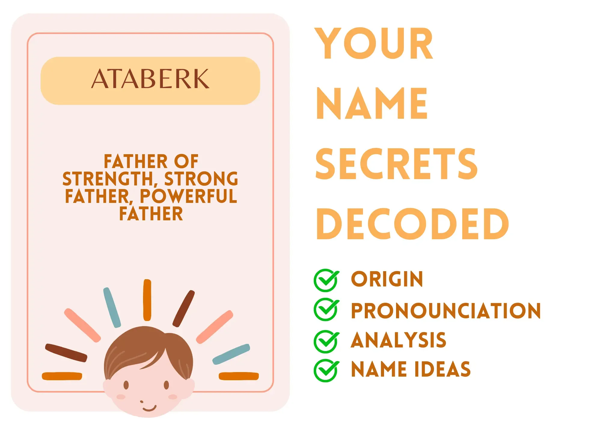 Ataberk is a Turkish name with a strong and distinctive sound. It is a combination of two words, 'ata' meaning 'father' and 'berk' signifying 'strong' or 'powerful'. This name carries a sense of lineage, strength, and authority. Primarily used for boys, Ataberk is a popular choice in Turkey and among Turkish communities worldwide.