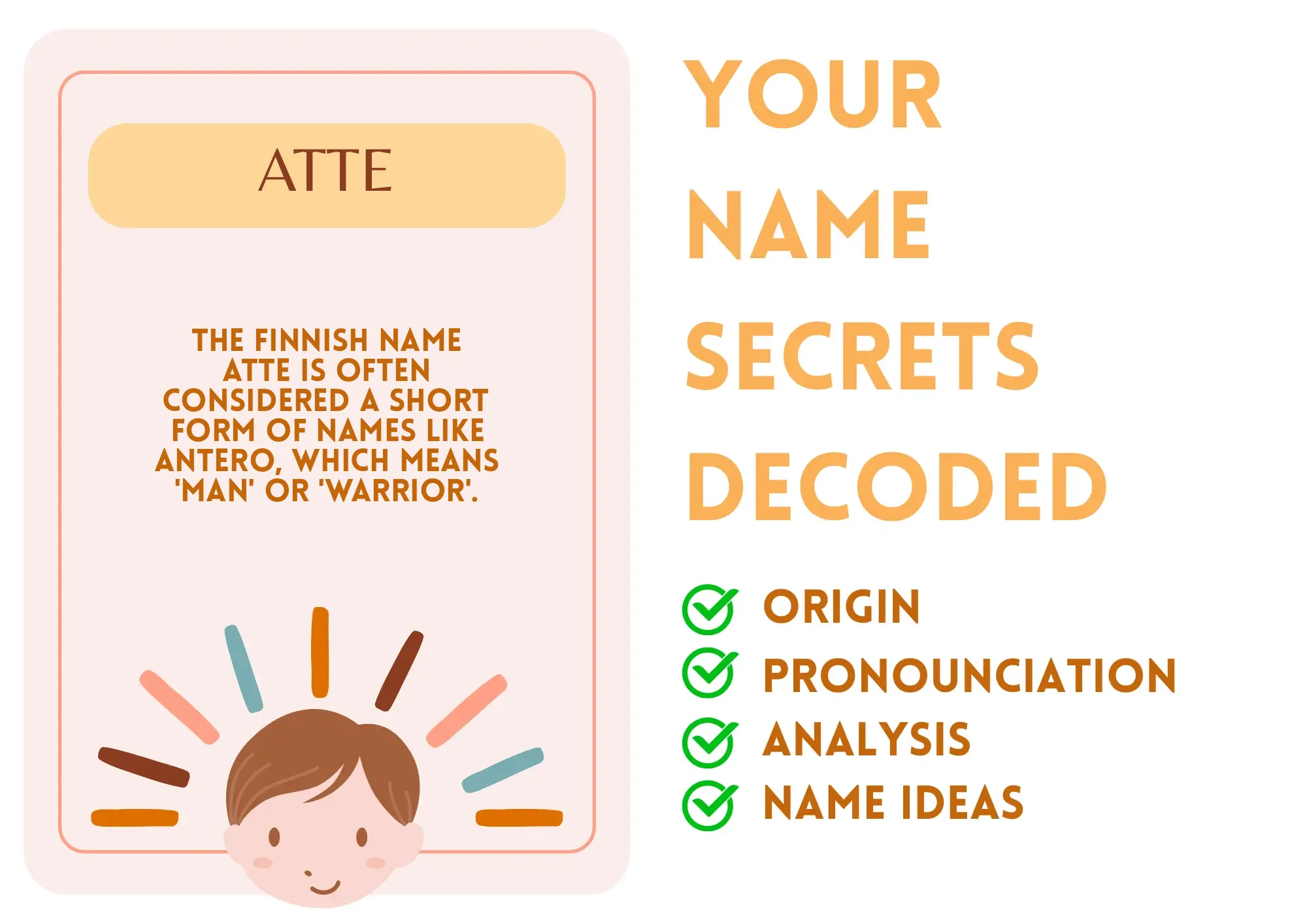 Meaning: The Finnish name Atte is often considered a short form of names like Antero, which means 'man' or 'warrior'.