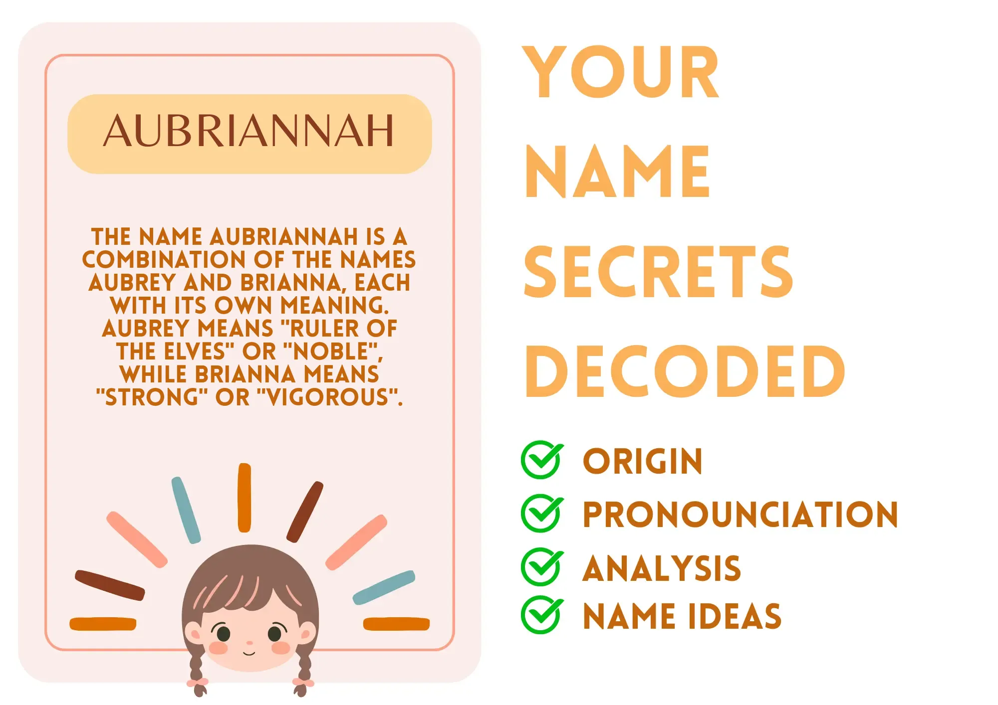 Meaning: The name Aubriannah is a combination of the names Aubrey and Brianna, each with its own meaning. Aubrey means "ruler of the elves" or "noble", while Brianna means "strong" or "vigorous".