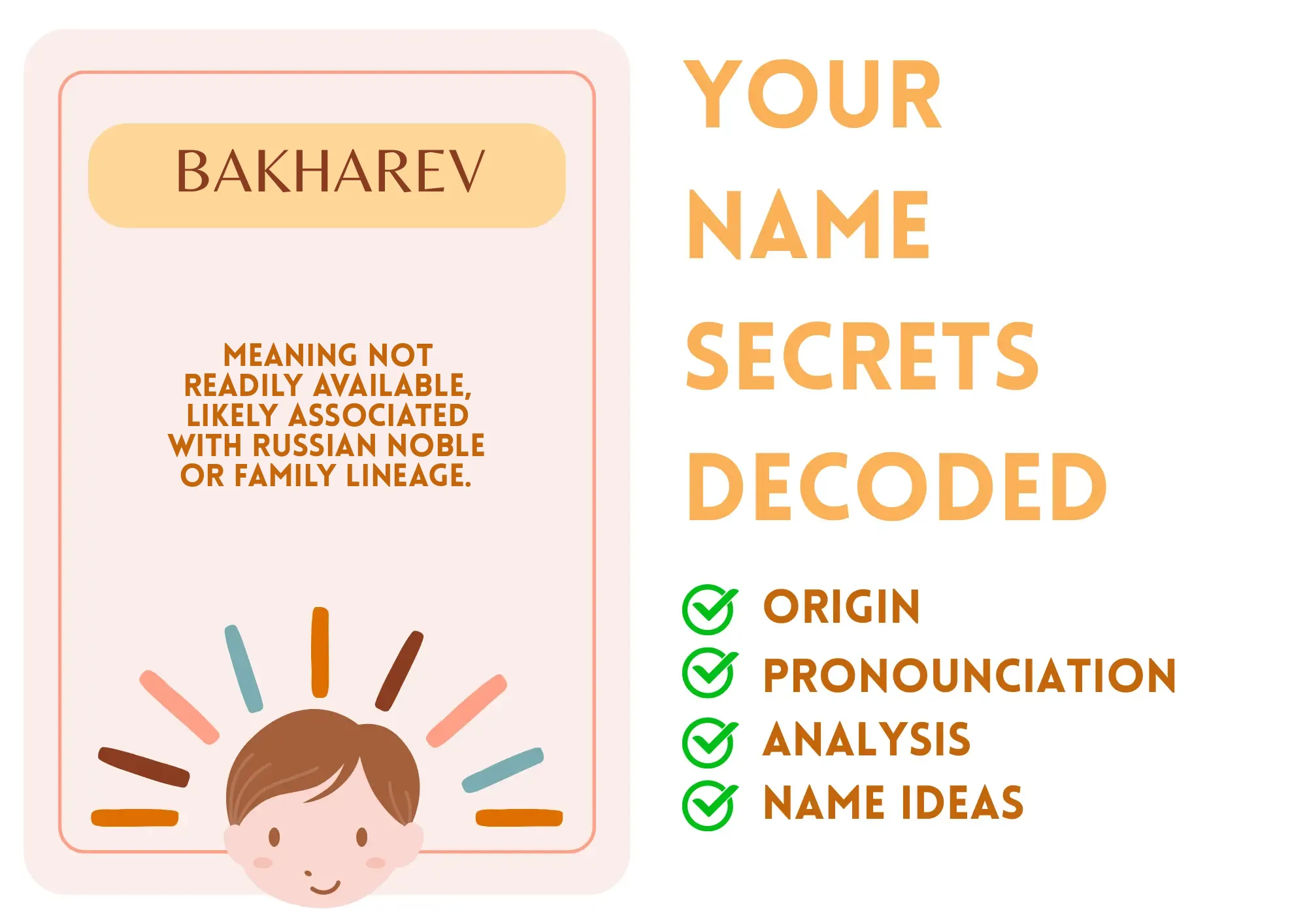 Bakharev is a unique and distinctive name of Russian origin. Its meaning is not readily available, but its association with Russian culture and history suggests it might be of noble or family lineage. While it is not commonly used as a given name, its strong and sophisticated sound makes it stand out. The name is primarily masculine, but its usage is rare and can be considered unique.