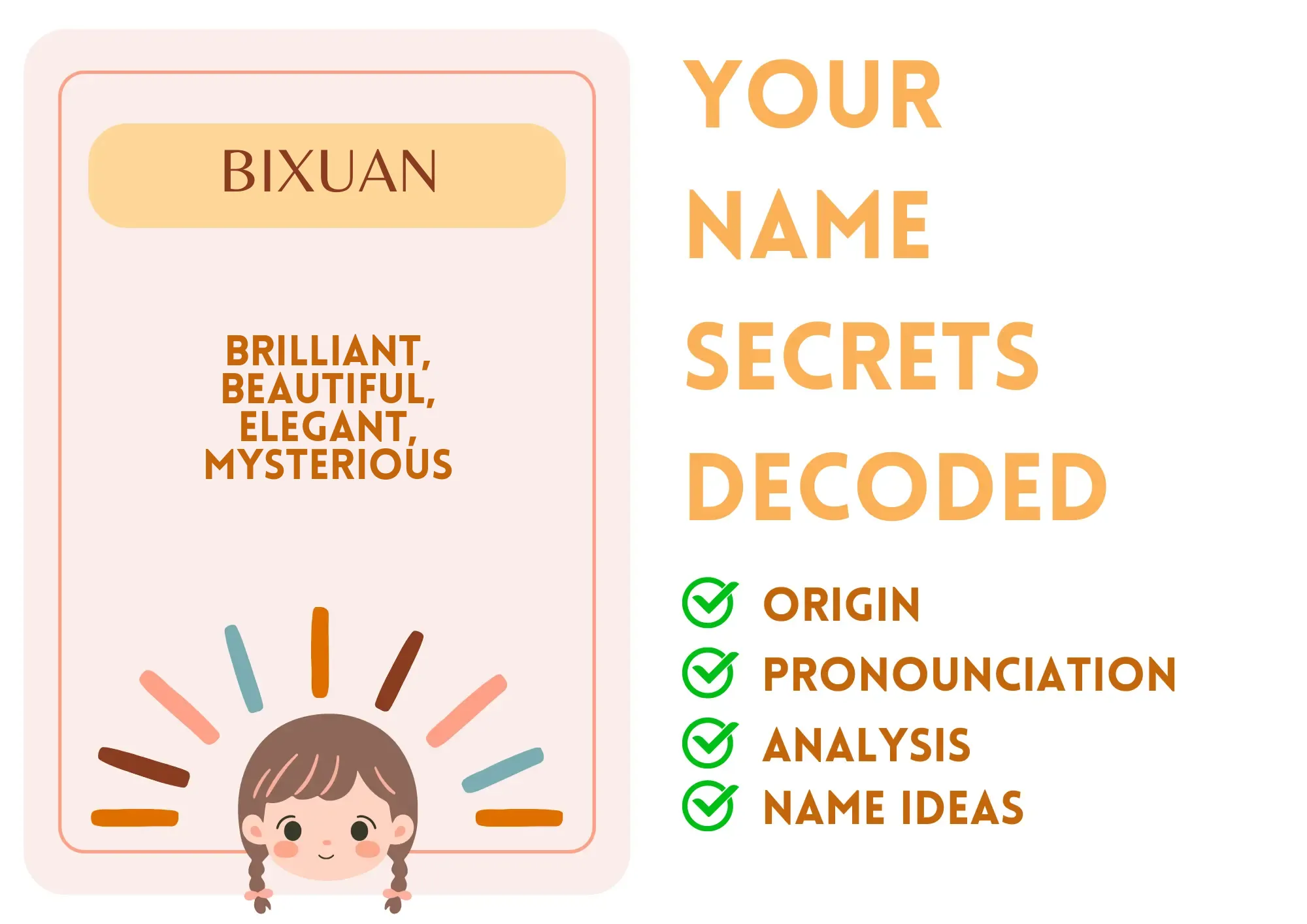 Bixuan is a name of Chinese origin, translating to 'brilliant' or 'beautiful' (光辉) and 'mysterious' or 'elegant' (雅). It is primarily a feminine name but can sometimes be used for boys as well. Bixuan is a name that embodies grace, sophistication, and a sense of mystery, making it an appealing choice for parents who value elegance and depth in a name.
