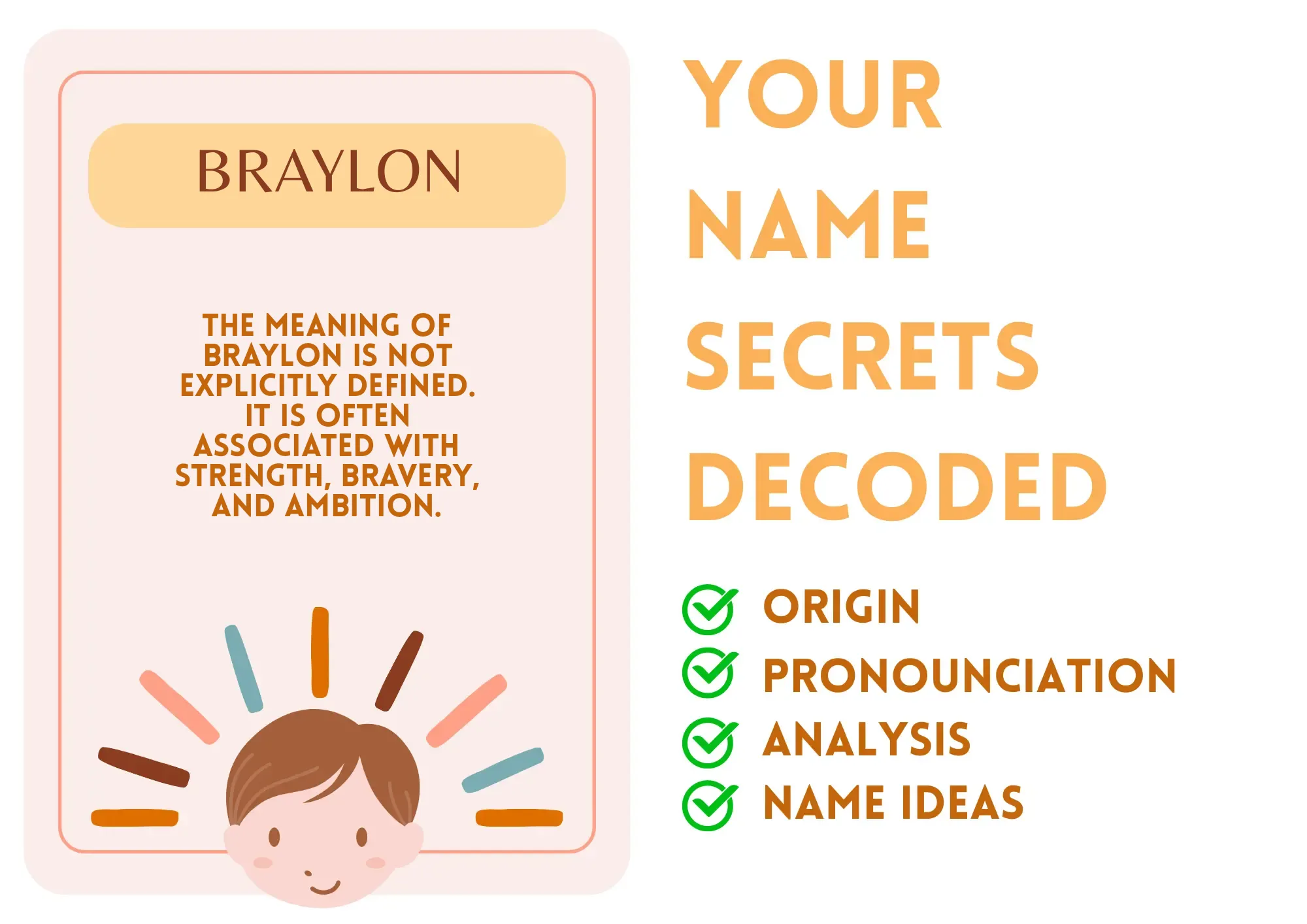Braylon is a modern and unique name with a strong, masculine sound. It is a blend of traditional and contemporary elements, offering a distinctive choice for parents seeking a name that stands out. While its meaning is not explicitly defined, it is often associated with strength, bravery, and ambition.