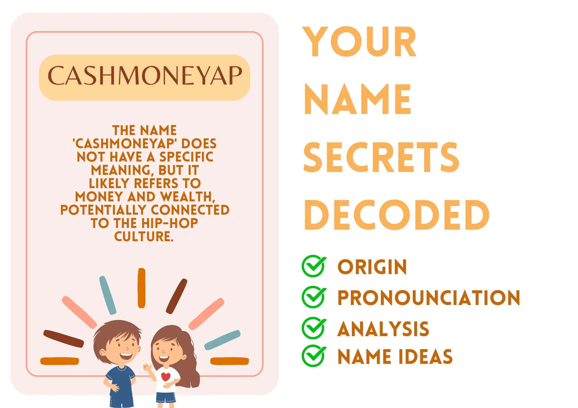 CashMoneyAP is a unique and modern name, primarily used as a nickname or online alias. It's not a traditional given name and lacks a clear meaning or origin. The name reflects a contemporary, often slang-driven, style of expression.