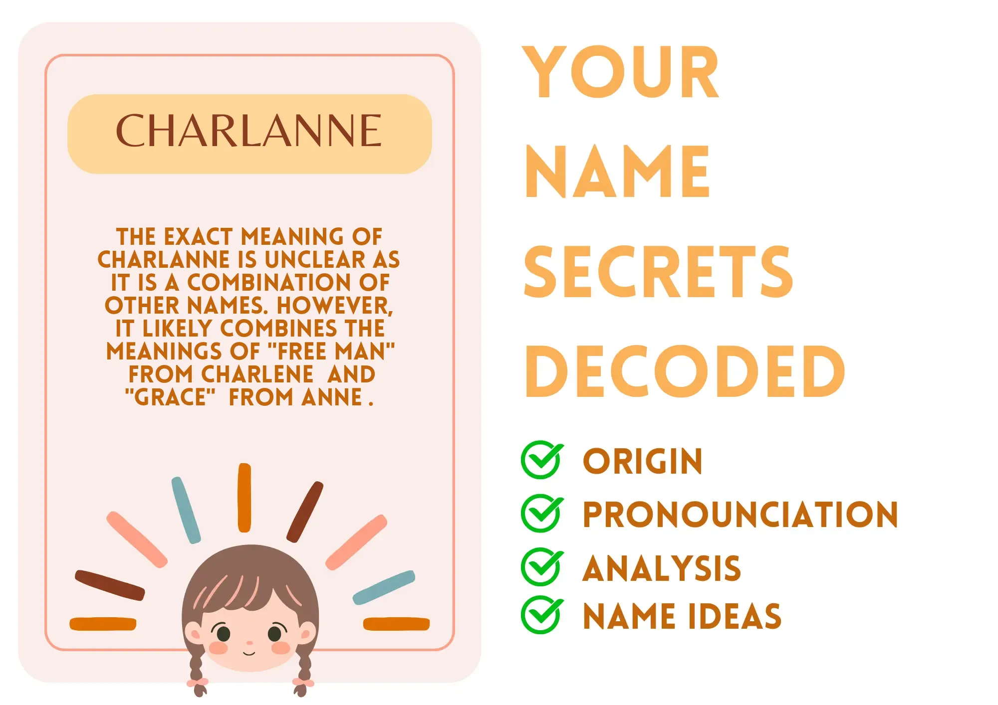 Meaning: The exact meaning of Charlanne is unclear as it is a combination of other names. However, it likely combines the meanings of "free man" (from Charlene) and "grace" (from Anne).