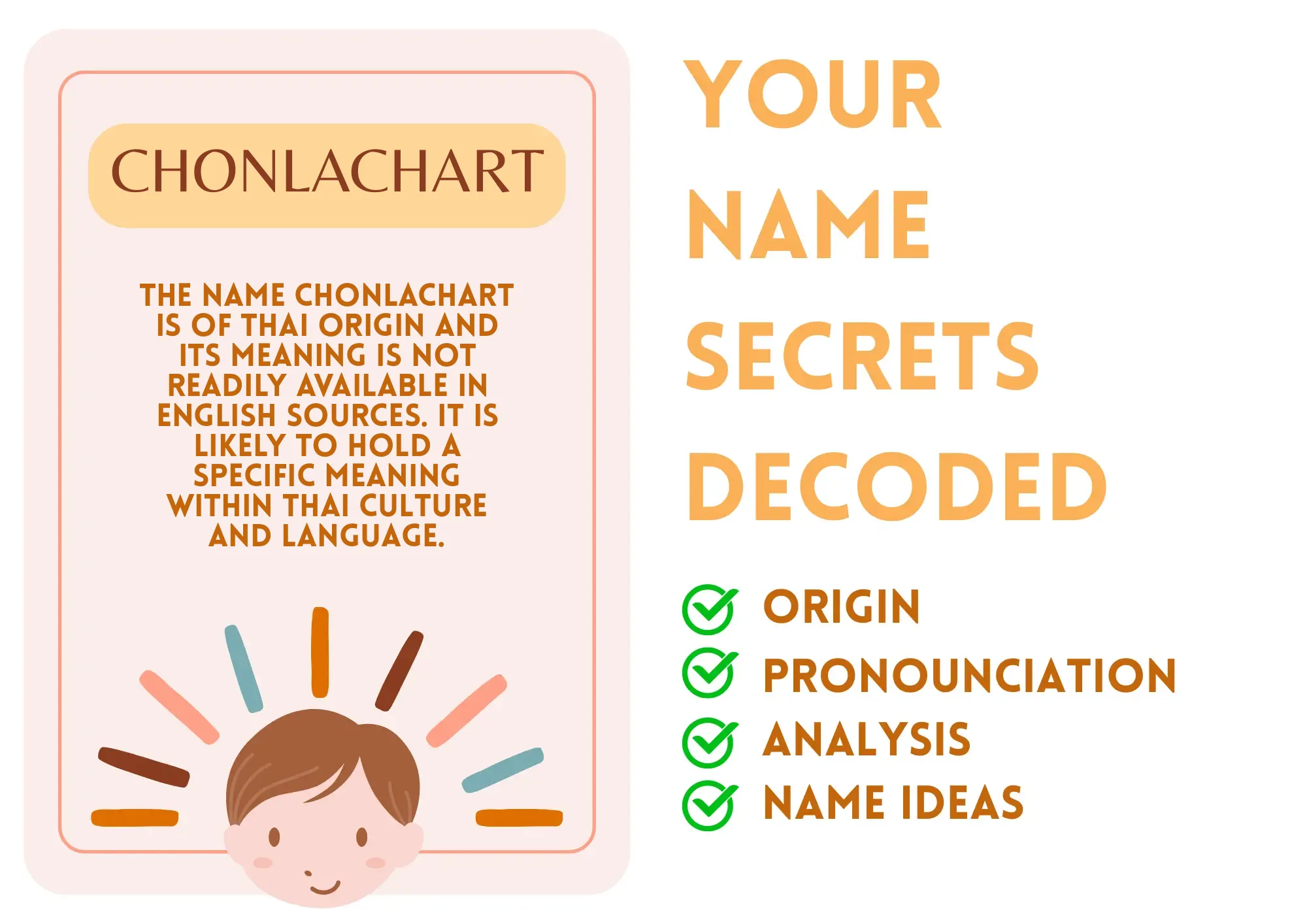 Chonlachart is a Thai name with a unique sound and meaning. It is primarily used for boys and holds cultural significance within Thailand. While not widely known outside of Thai communities, the name carries a sense of strength and individuality. It is easy to pronounce and spell, though some may find it unfamiliar.