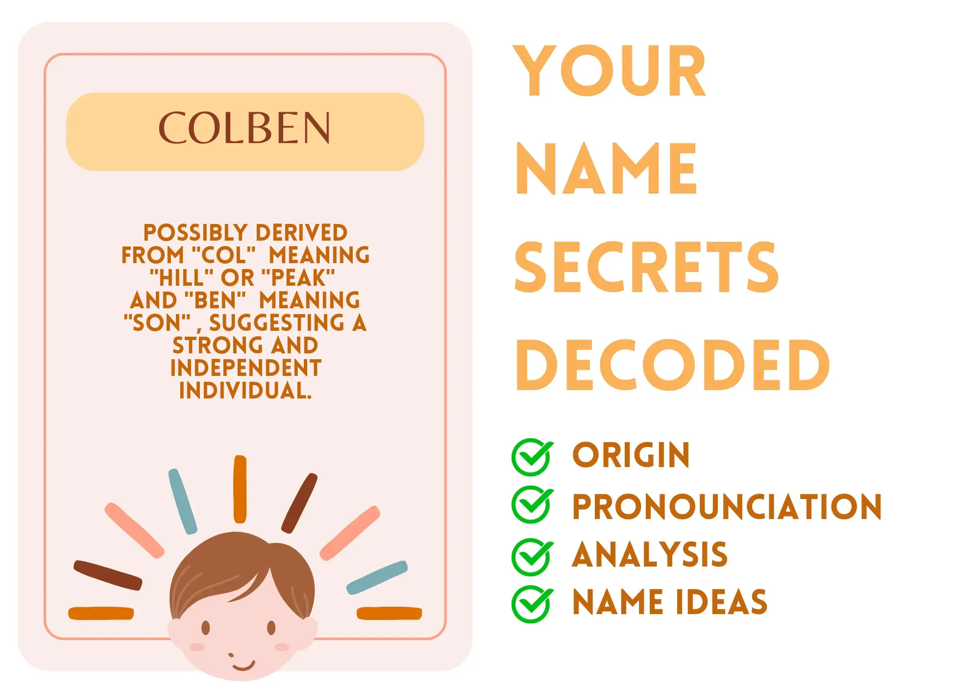 Colben is a unique and modern name with a strong and masculine sound. It is primarily used for boys and has origins in the English language, possibly derived from a combination of the words "col" (meaning "hill" or "peak") and "ben" (meaning "son"). The name suggests a strong and independent individual, someone who stands tall and reaches for their goals.