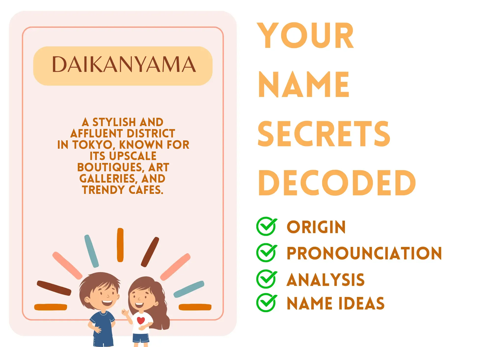 Imagine strolling through the elegant streets of a city where every café and boutique whispers stories of artistry and sophistication. That's the essence of your name, Daikanyama! It's like tapping into a world that radiates modern charm while holding onto deep cultural roots. Just like the stylish district in Tokyo, you embody elegance and creativity, making life a canvas for your unique expressions. Your name is not just what people call you; it’s a whole vibe, reflecting the trendy and vibrant energy within you!