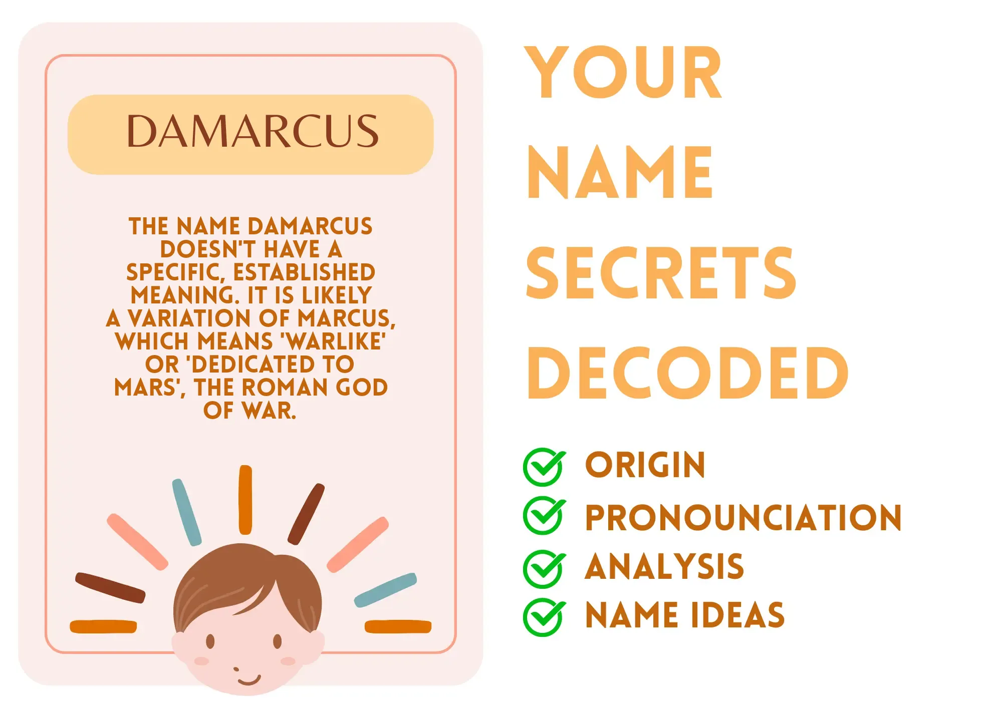 Meaning: The name Damarcus doesn't have a specific, established meaning. It is likely a variation of Marcus, which means 'warlike' or 'dedicated to Mars', the Roman god of war.