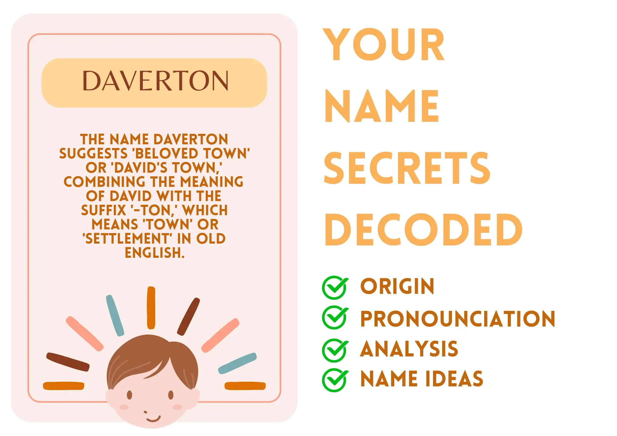 Meaning: The name Daverton suggests 'beloved town' or 'David's town,' combining the meaning of David with the suffix '-ton,' which means 'town' or 'settlement' in Old English.