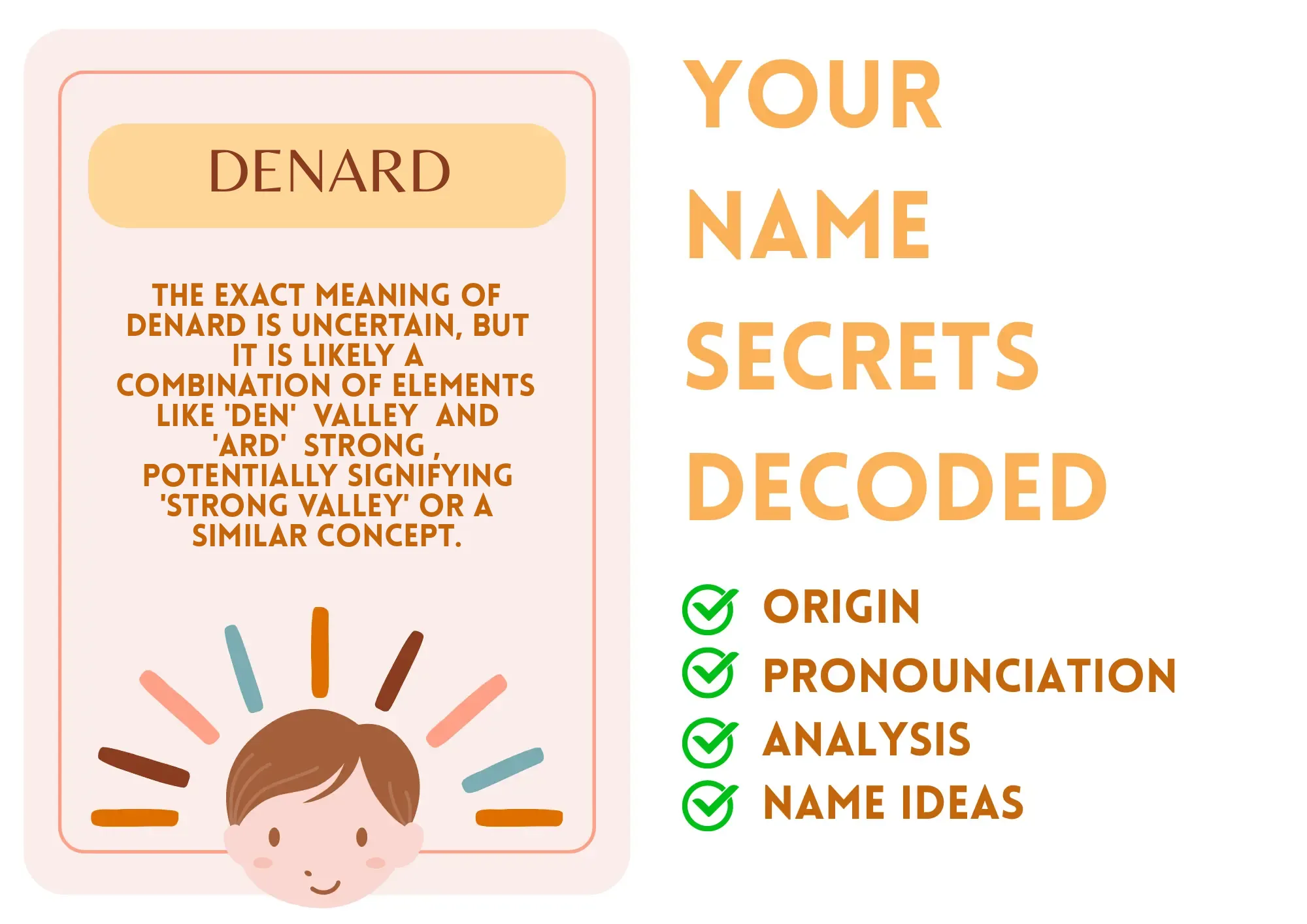 Meaning: The exact meaning of Denard is uncertain, but it is likely a combination of elements like 'Den' (valley) and 'ard' (strong), potentially signifying 'strong valley' or a similar concept.