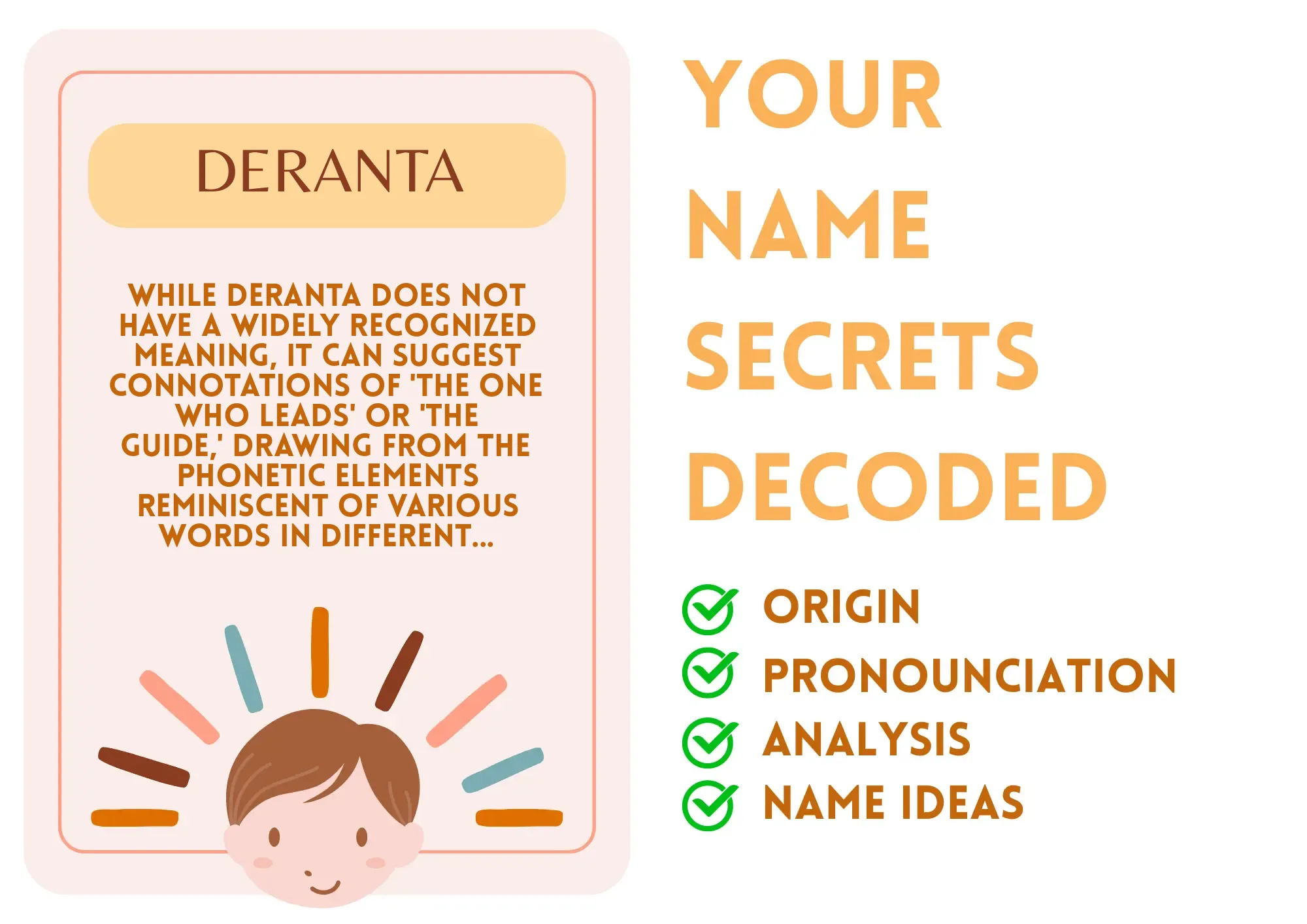 The name is appreciated for its rarity and originality, evoking feelings of adventure and uniqueness. With a smooth flow and pleasant sound, Deranta is easy to articulate and spell, inviting positive associations.