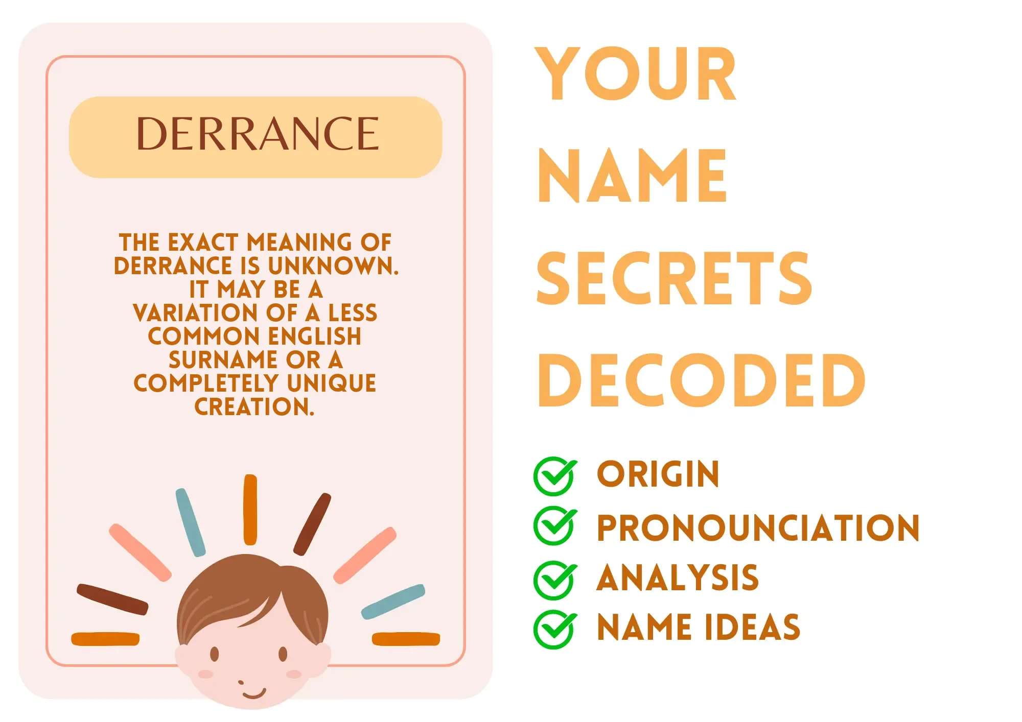 Meaning: The exact meaning of Derrance is unknown. It may be a variation of a less common English surname or a completely unique creation.