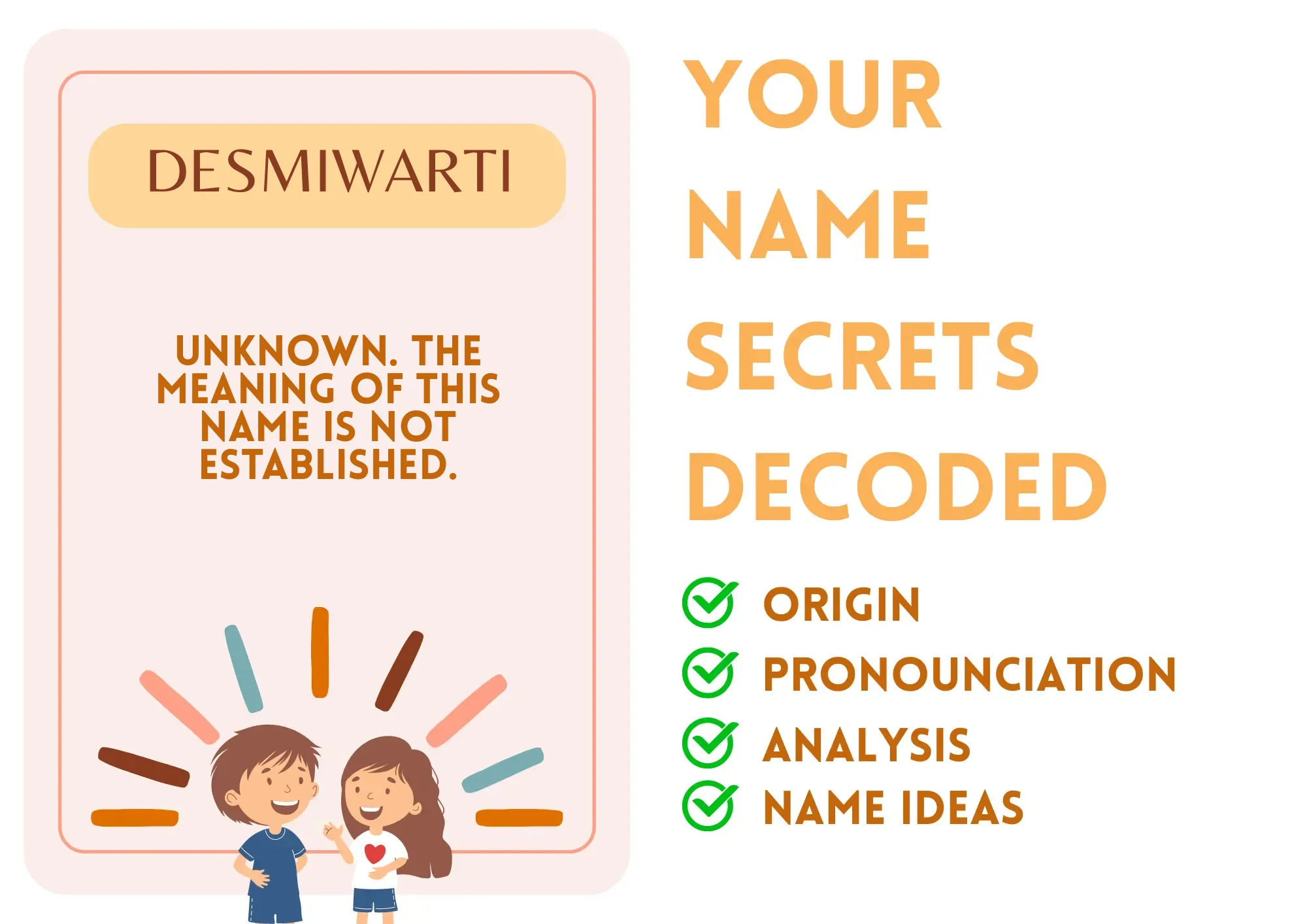 Hey there! You ever feel like you’re a bit different from everyone else? Maybe you’re the one who dances to the beat of your drum when everyone’s swaying to the top hits. Well, if your name is Desmiwarti, you're probably a living example of that! With a name as unique as a rare Pokémon, you have a world of potential waiting for you. Your name is special and carries an essence that sparks curiosity. It's your secret superpower, allowing you to light up any room you walk into—whether it's a classroom, cafeteria, or even a virtual meeting!