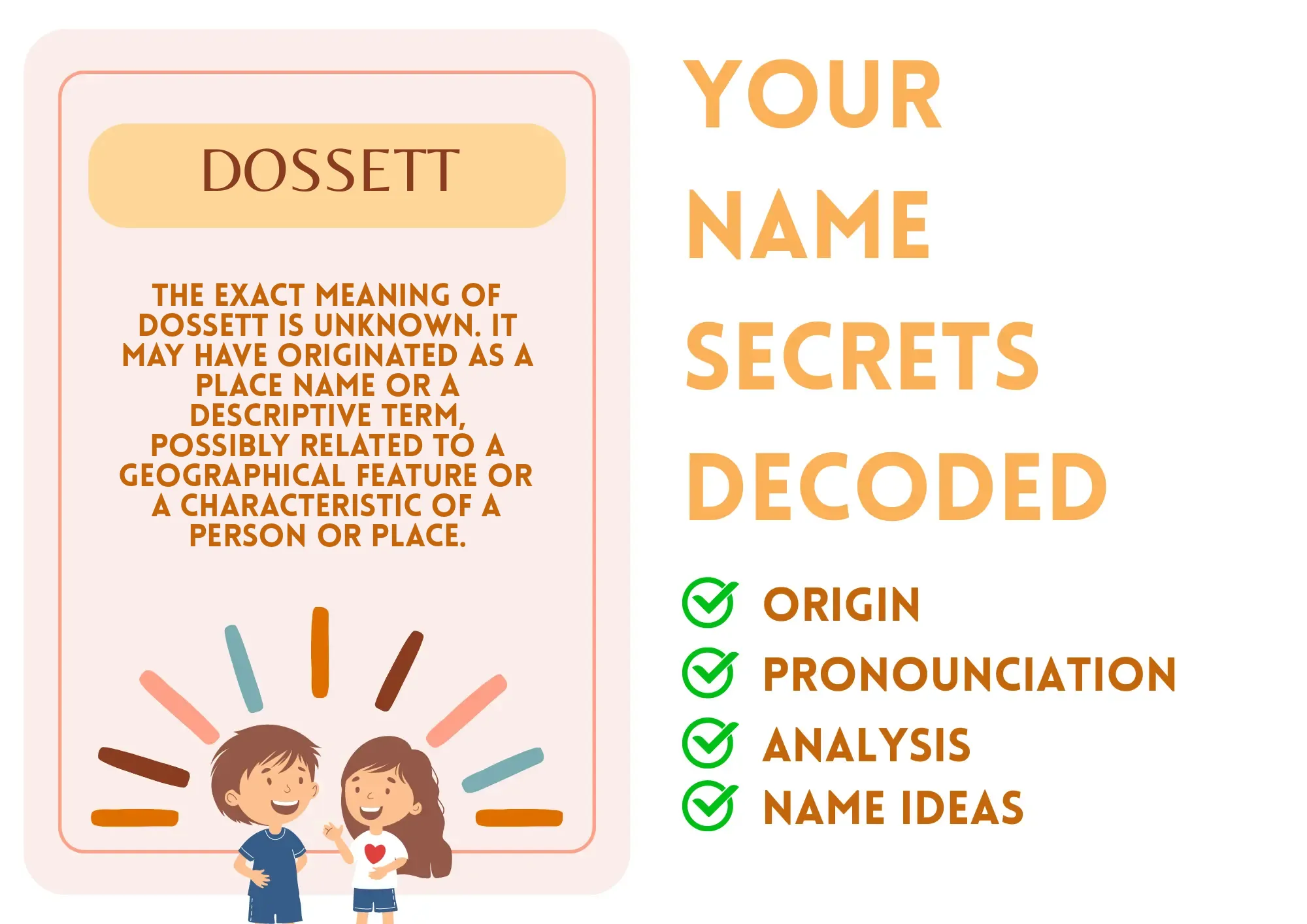 Meaning: The exact meaning of Dossett is unknown. It may have originated as a place name or a descriptive term, possibly related to a geographical feature or a characteristic of a person or place.