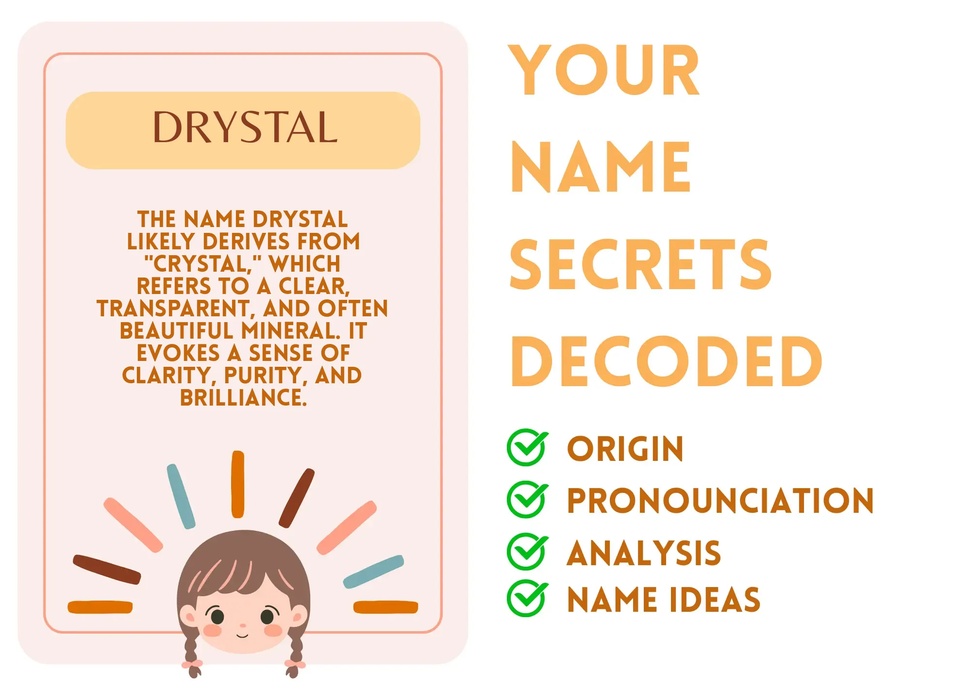 Drystal is a unique and modern name, likely a creative variation of "Crystal." While it's not widely used, it carries a similar feel of sparkle and brilliance. The name is typically considered feminine and suggests a strong, independent, and perhaps even slightly unconventional personality.