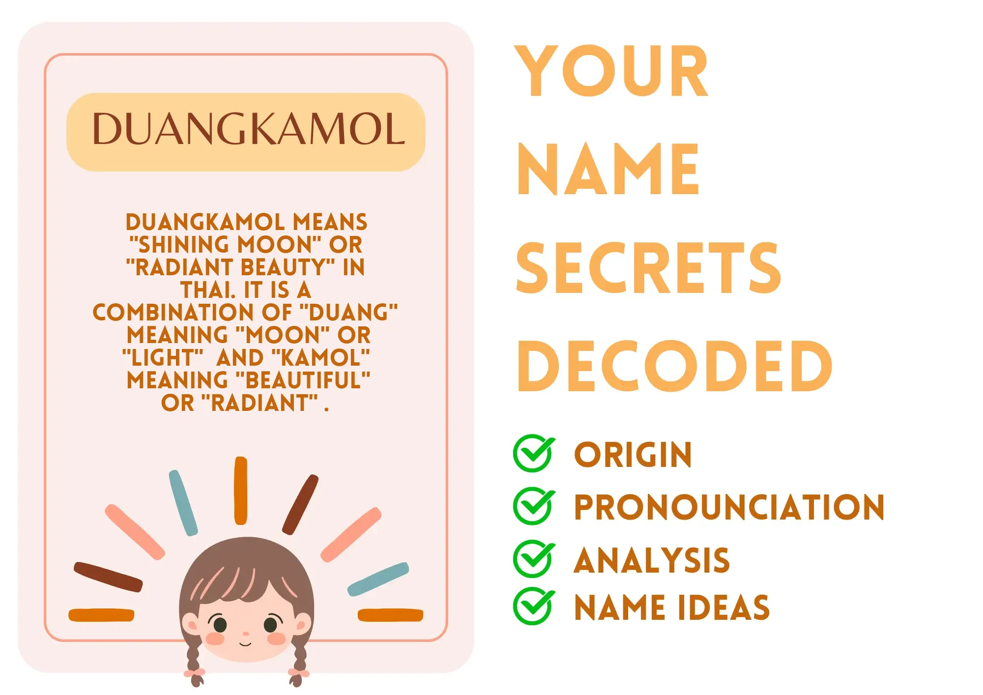 Duangkamol is a beautiful and unique Thai name with a rich meaning. It is primarily used for girls and is a combination of two words, "duang" and "kamol," both signifying positive qualities. The name evokes a sense of grace, beauty, and auspiciousness, making it a popular choice among Thai families.