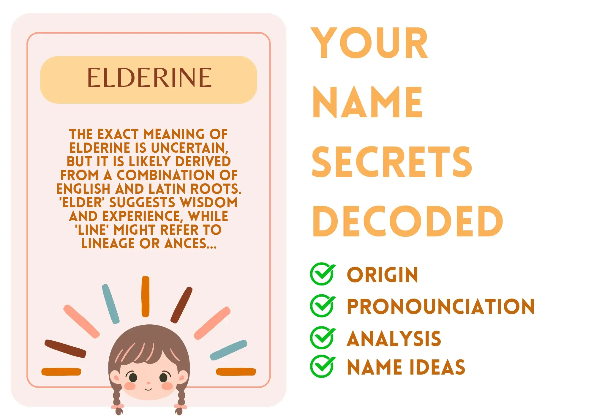 Meaning: The exact meaning of Elderine is uncertain, but it is likely derived from a combination of English and Latin roots. 'Elder' suggests wisdom and experience, while 'line' might refer to lineage or ancestry.