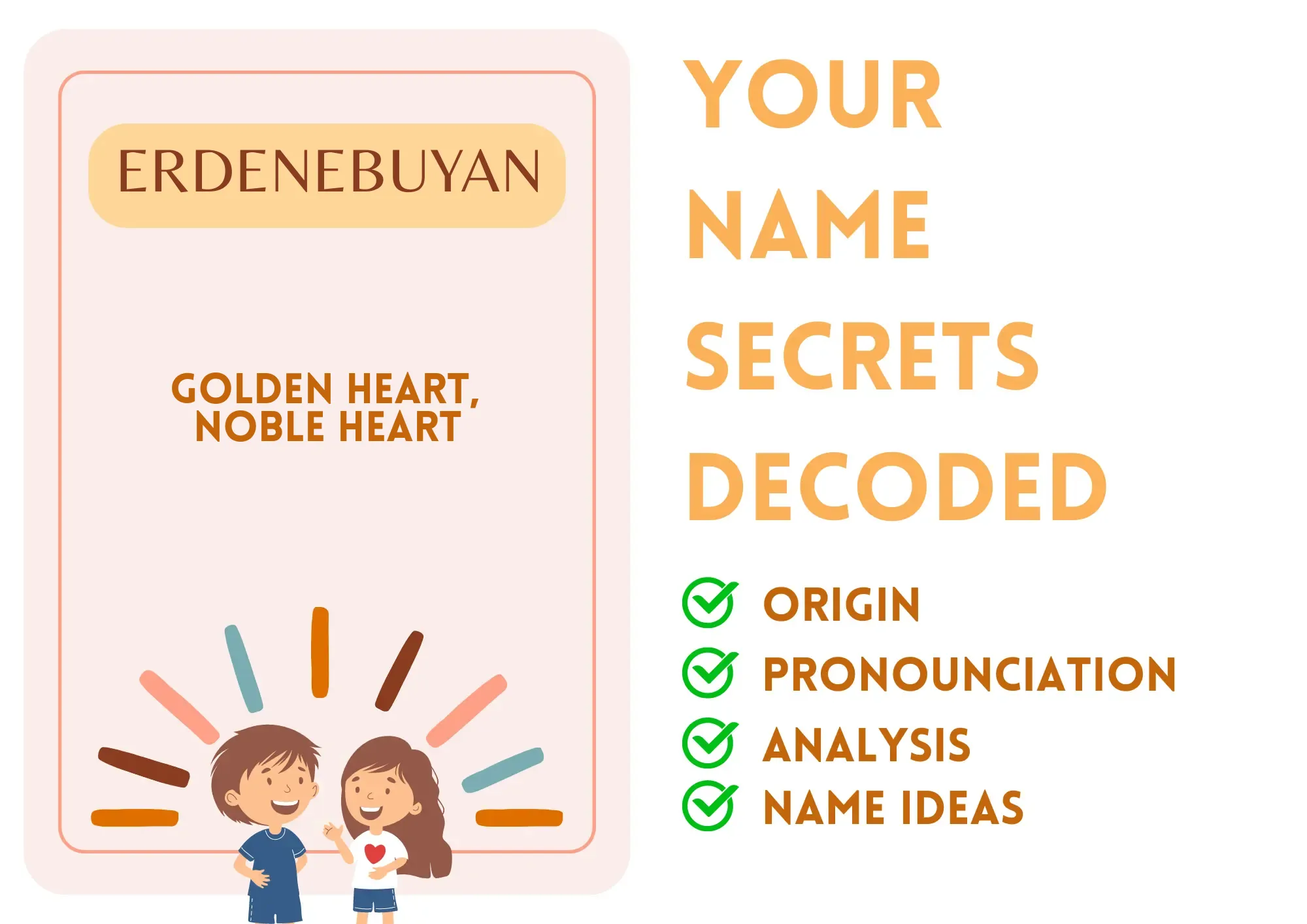 Erdenebuyan is a unique and culturally rich name of Mongolian origin, which translates to 'golden heart' or 'noble heart.' It carries a deep significance, embodying ideals of kindness, nobility, and warmth. Primarily used for boys, Erdenebuyan also has a unisex quality, appealing to parents who appreciate its profound meaning and cultural relevance.