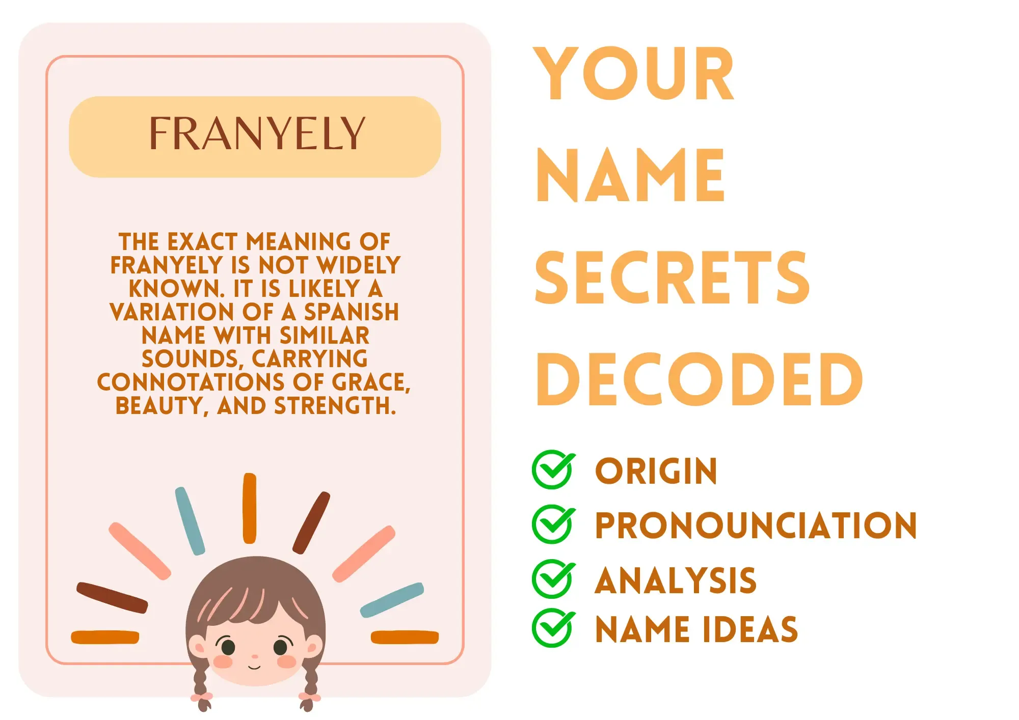 Meaning: The exact meaning of Franyely is not widely known. It is likely a variation of a Spanish name with similar sounds, carrying connotations of grace, beauty, and strength.