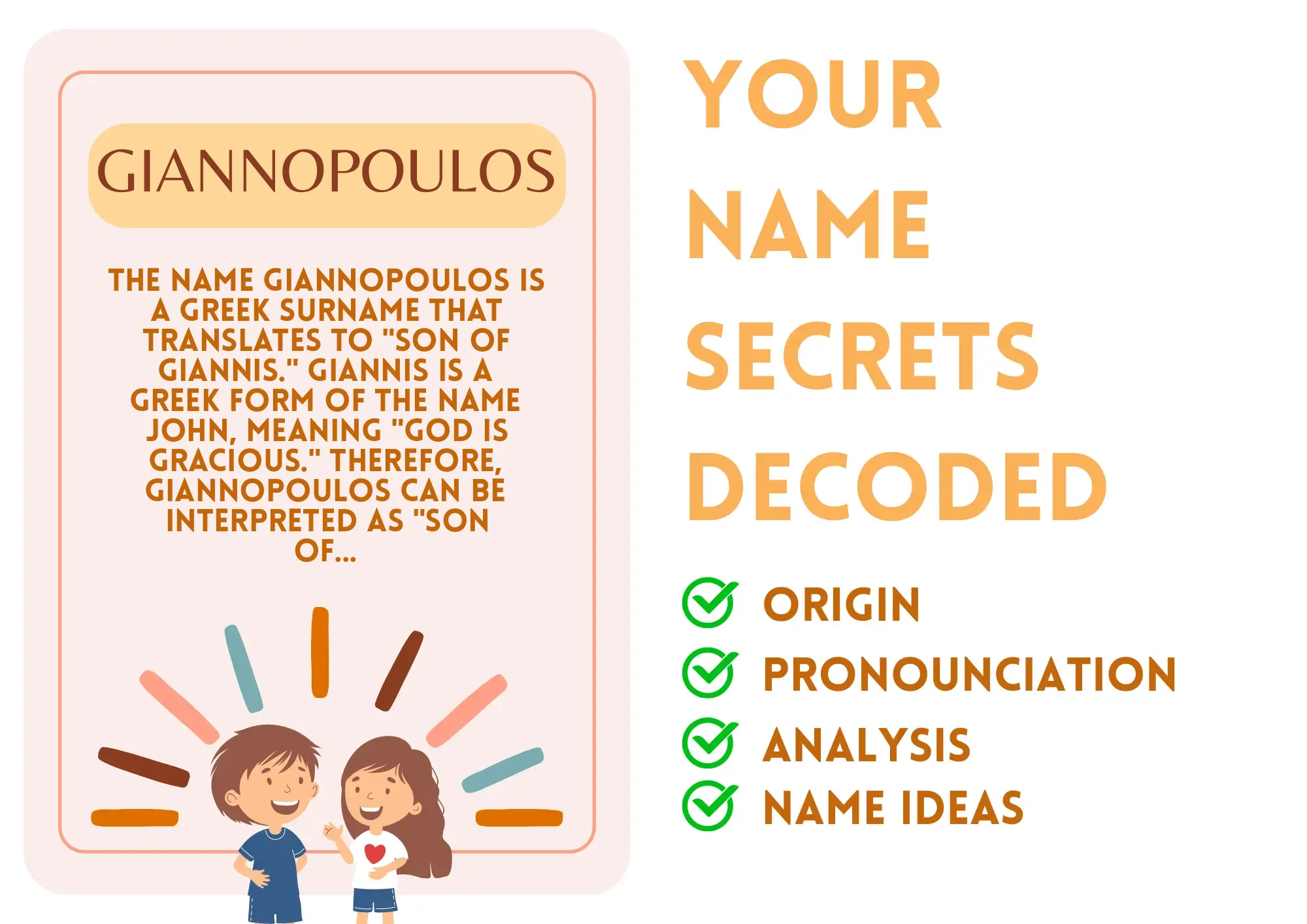 Meaning: The name Giannopoulos is a Greek surname that translates to "son of Giannis." Giannis is a Greek form of the name John, meaning "God is gracious." Therefore, Giannopoulos can be interpreted as "son of God is gracious."