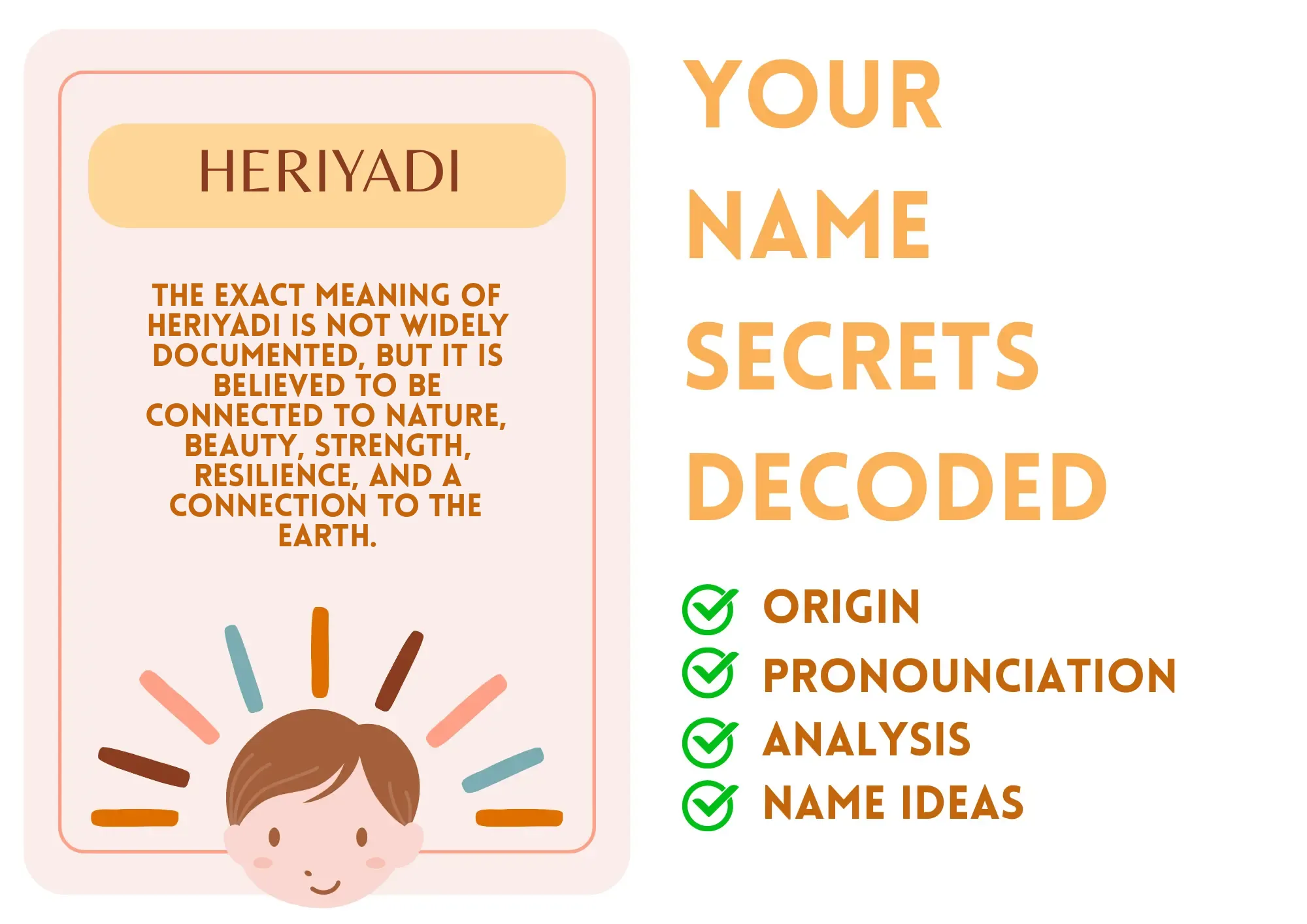 Meaning: The exact meaning of Heriyadi is not widely documented, but it is believed to be connected to nature, beauty, strength, resilience, and a connection to the earth.