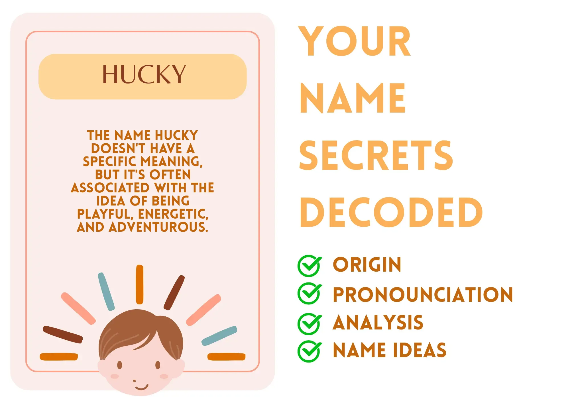 Hucky is a unique and playful name, often perceived as a nickname or a shortened form of a longer name. It's a charming and informal choice, evoking a sense of fun and energy. While the name doesn't carry a specific historical or cultural significance, it's known for its lightheartedness and friendly vibe.