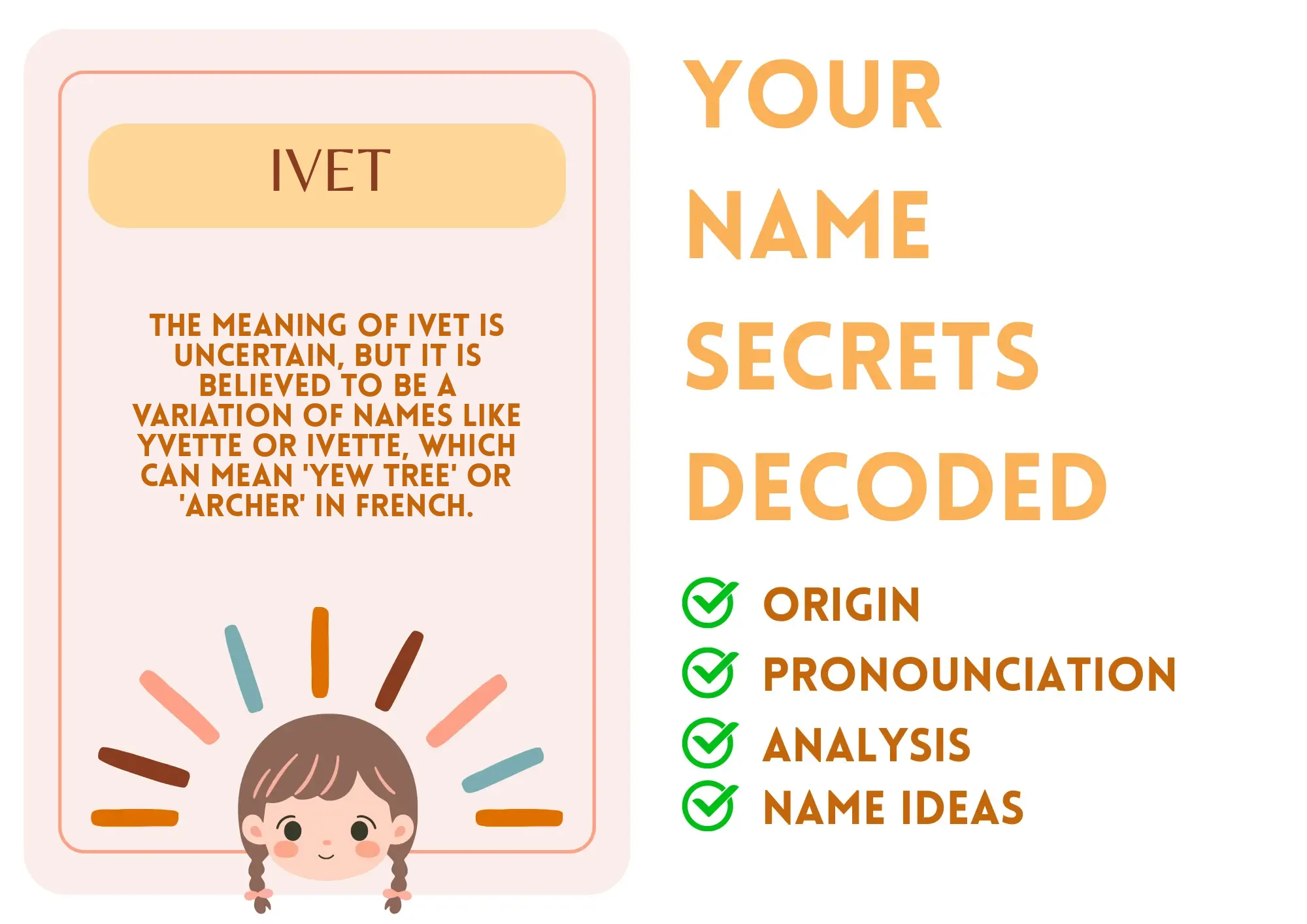 Meaning: The meaning of Ivet is uncertain, but it is believed to be a variation of names like Yvette or Ivette, which can mean 'yew tree' or 'archer' in French.