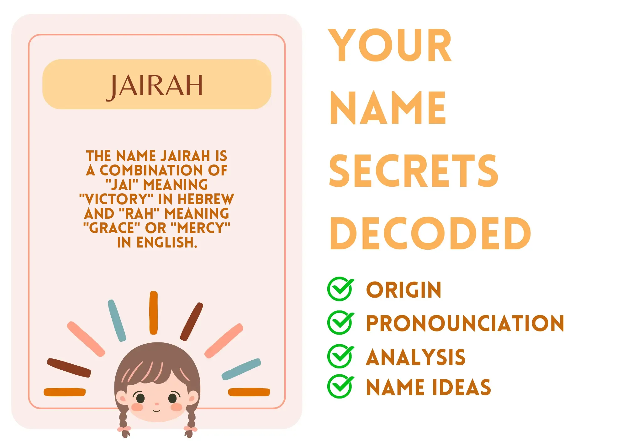 The name Jairah is a blend of "Jai," which means "victory" in Hebrew, and "rah," which translates to "grace" or "mercy" in English. Imagine standing at the finish line of your first race, the cheers of friends echoing in your ears as you realize you've not only crossed it but done so gracefully. That's Jairah for you! In life, she approaches challenges with two powerful tools: her determination and grace. When difficulties arise, she doesn’t just tackle them head-on; she dances around them, bringing a touch of joy to each triumph she achieves. This duality makes her an absolute force of nature!