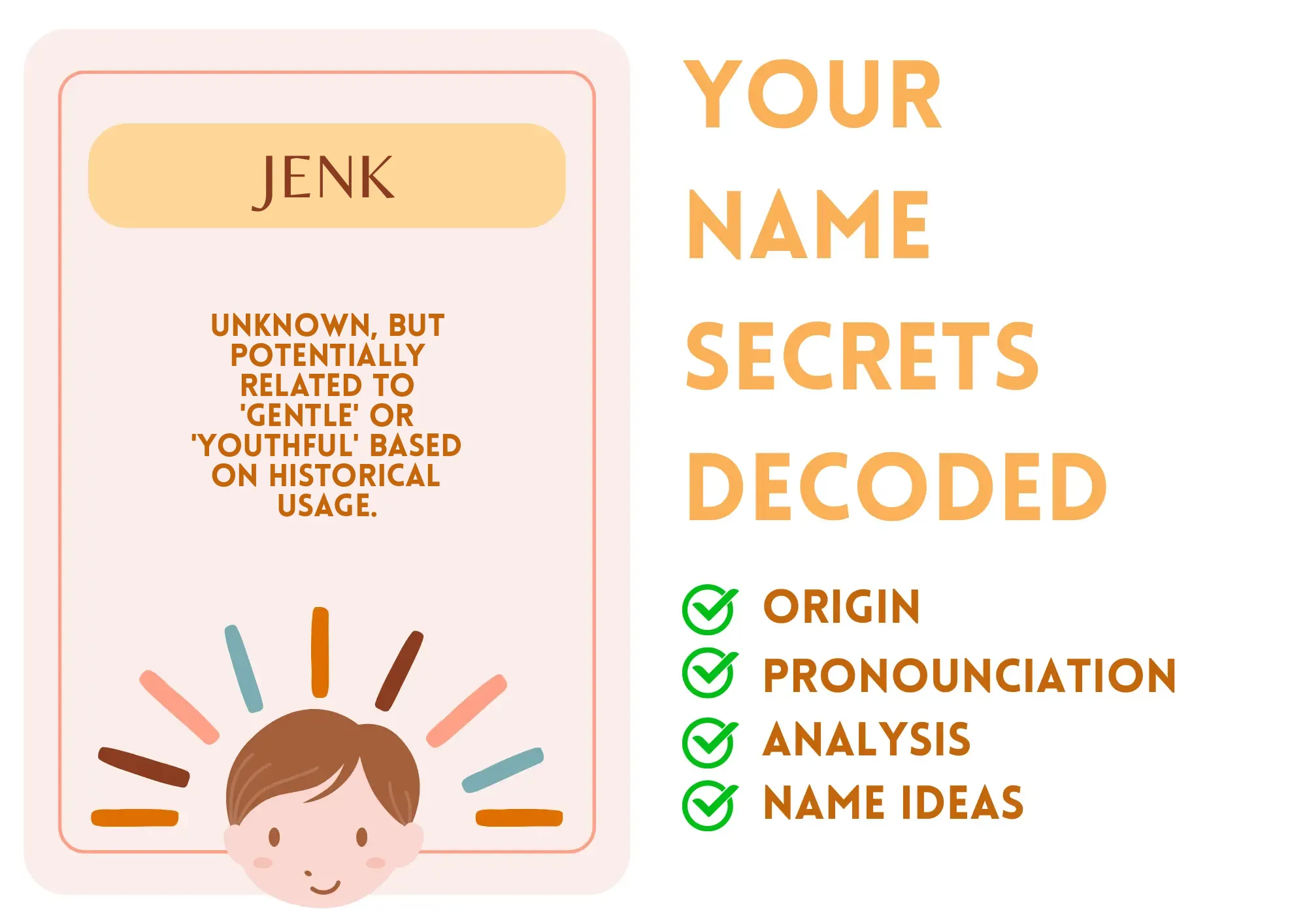 Jenk is an uncommon name, primarily used as a surname, though it has recently gained some traction as a given name, particularly for boys. Its origin is uncertain, but it is believed to be of English origin, potentially derived from a place name or a nickname. While the meaning is unclear, it could be associated with 'gentle' or 'youthful' based on its historical usage.