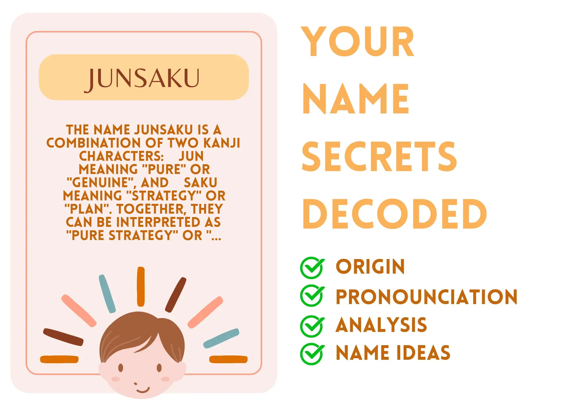 The name Junsaku is a magical blend of two kanji characters: 純 (jun) for "pure" and 策 (saku) for "strategy." Together, they form the meaning of "pure strategy." Imagine you’re an artist with a blank canvas, ready to paint your masterpiece with a thoughtful approach. Junsaku is all about weaving honesty and tact into every life choice—be it deciding on the next video game to conquer or the way to approach a new friendship. This means that in your life, you likely carry an innate ability to break down heavy dilemmas into digestible bits, helping you and others navigate through challenges with grace.