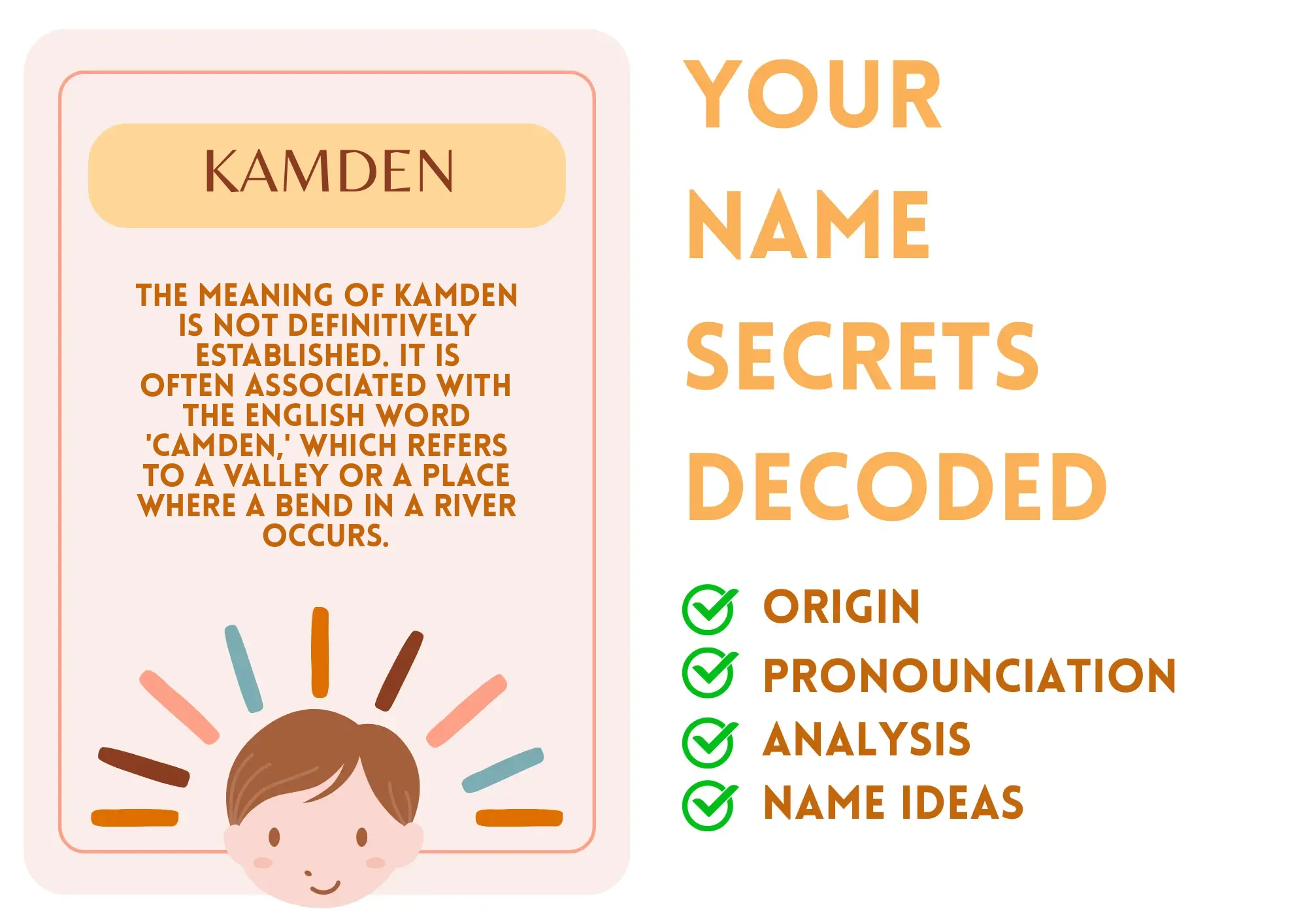 Meaning: The meaning of Kamden is not definitively established. It is often associated with the English word 'camden,' which refers to a valley or a place where a bend in a river occurs.