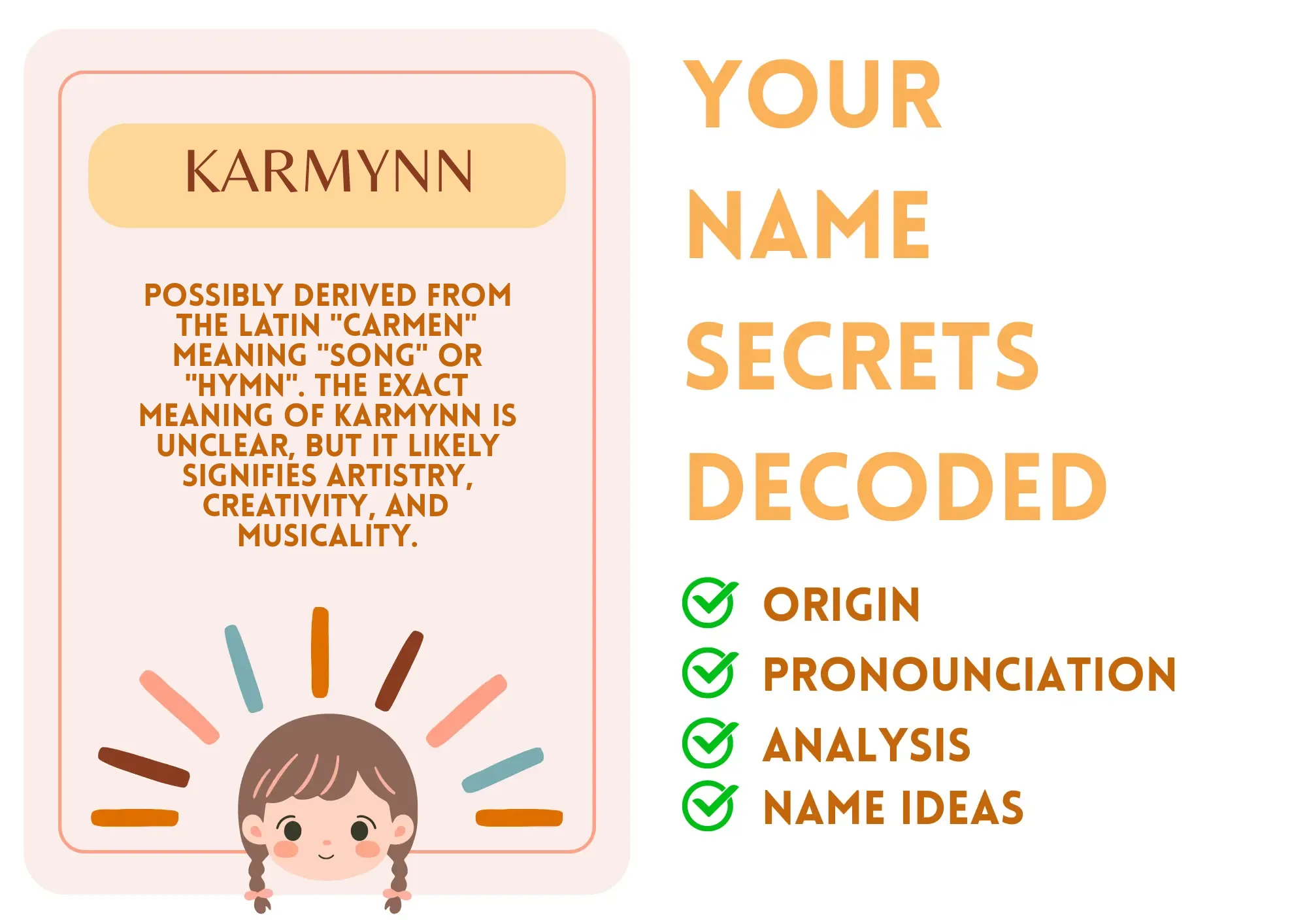 Meaning: Possibly derived from the Latin "Carmen" meaning "song" or "hymn". The exact meaning of Karmynn is unclear, but it likely signifies artistry, creativity, and musicality.