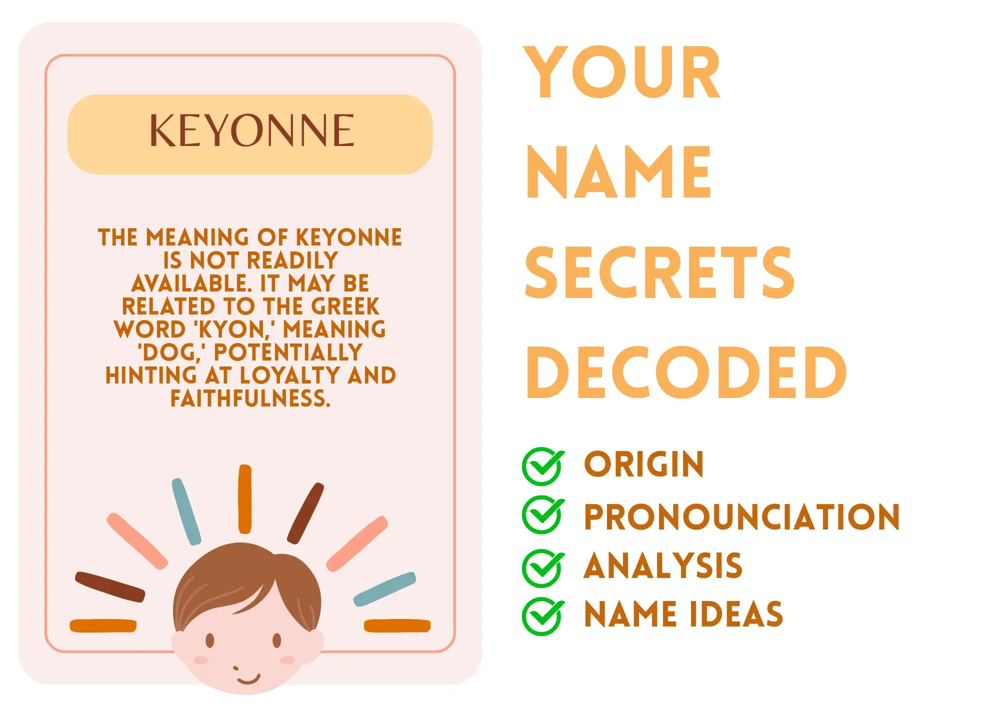 Keyonne is a unique and modern name with a strong, melodic sound. While its meaning is not readily available, its origins suggest a connection to the Greek word 'kyon,' meaning 'dog,' potentially hinting at loyalty and faithfulness. This connection, however, is not definitive and the name's true meaning remains open to interpretation.