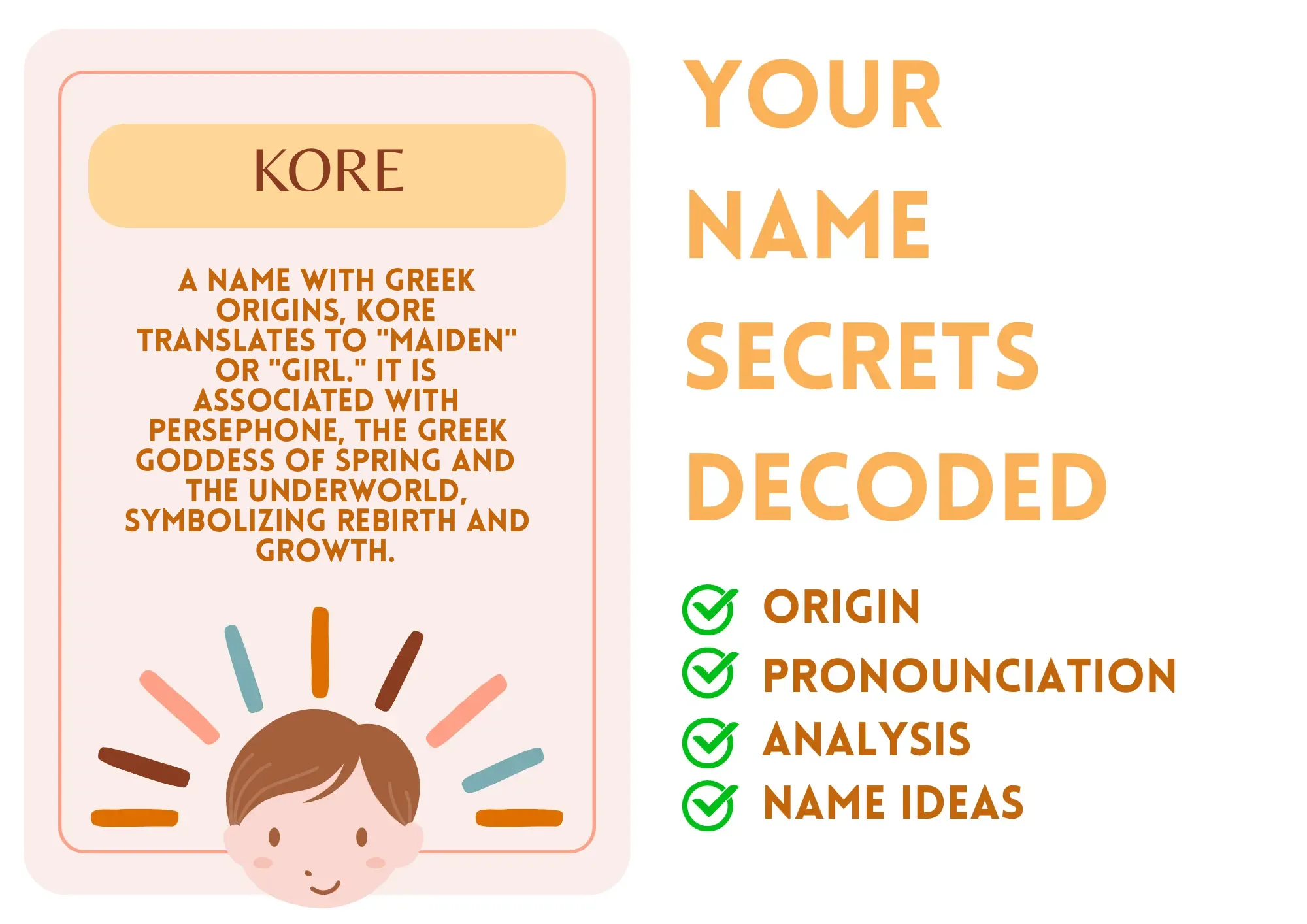 Origin: The name Kore has Greek origins, derived from the Greek word "Kore," meaning "maiden" or "girl."