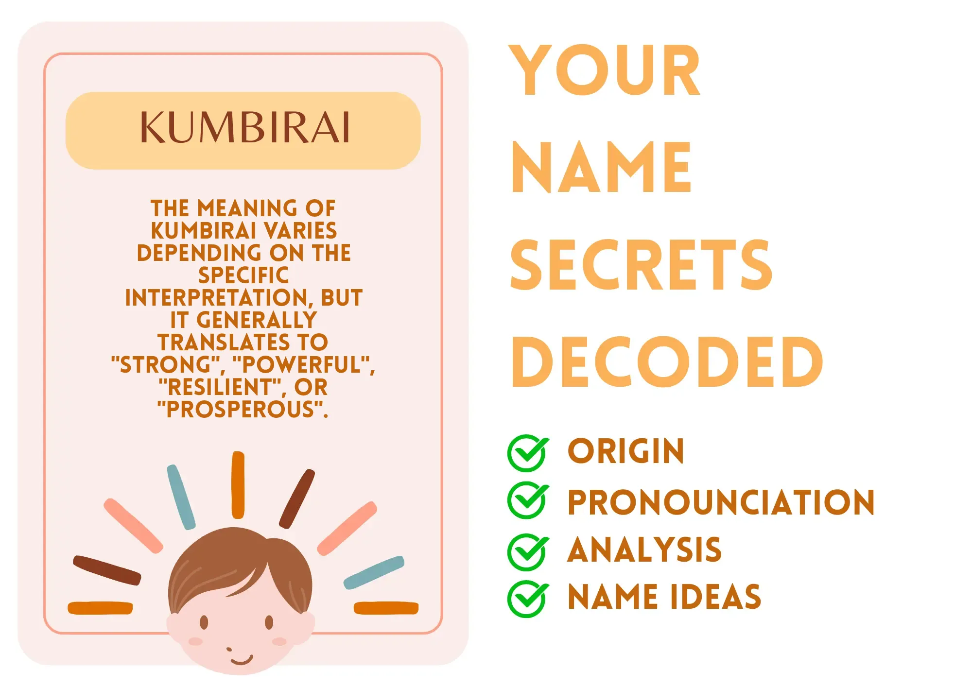 The name Kumbirai translates to “strong,” “powerful,” “resilient,” or “prosperous.” Just like a mighty tree that withstands storms, Kumbirai has a natural ability to endure difficulties with a sense of grace. Picture someone who breathes determination at every step, whether it means leading a team or lifting others as they climb. Kumbirai radiates strength, showing up when it counts, be it in sports, academics, or life challenges, like a hero ready to save the day!