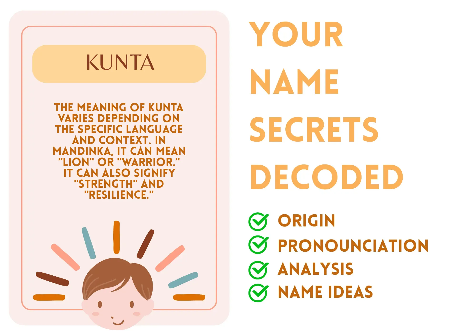 Meaning: The meaning of Kunta varies depending on the specific language and context. In Mandinka, it can mean "lion" or "warrior." It can also signify "strength" and "resilience."