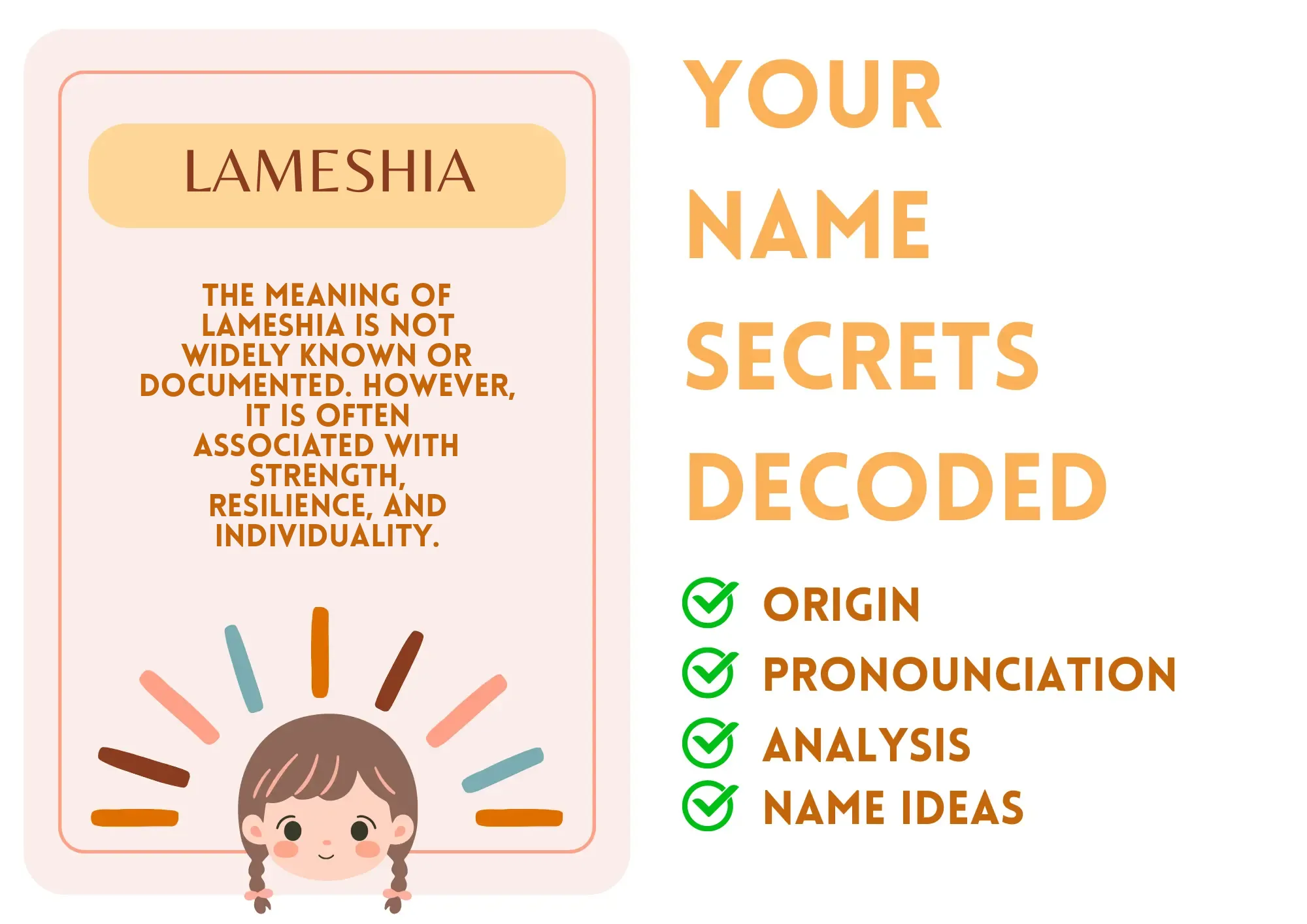 Meaning: The meaning of Lameshia is not widely known or documented. However, it is often associated with strength, resilience, and individuality.