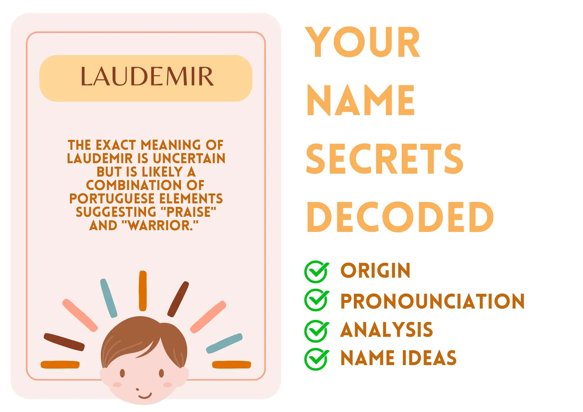 Laudemir is a unique and uncommon name with a strong, masculine sound. It is of Portuguese origin, likely a combination of elements meaning "praise" and "warrior." While not widely used, Laudemir holds a distinct charm and evokes a sense of strength and honor.