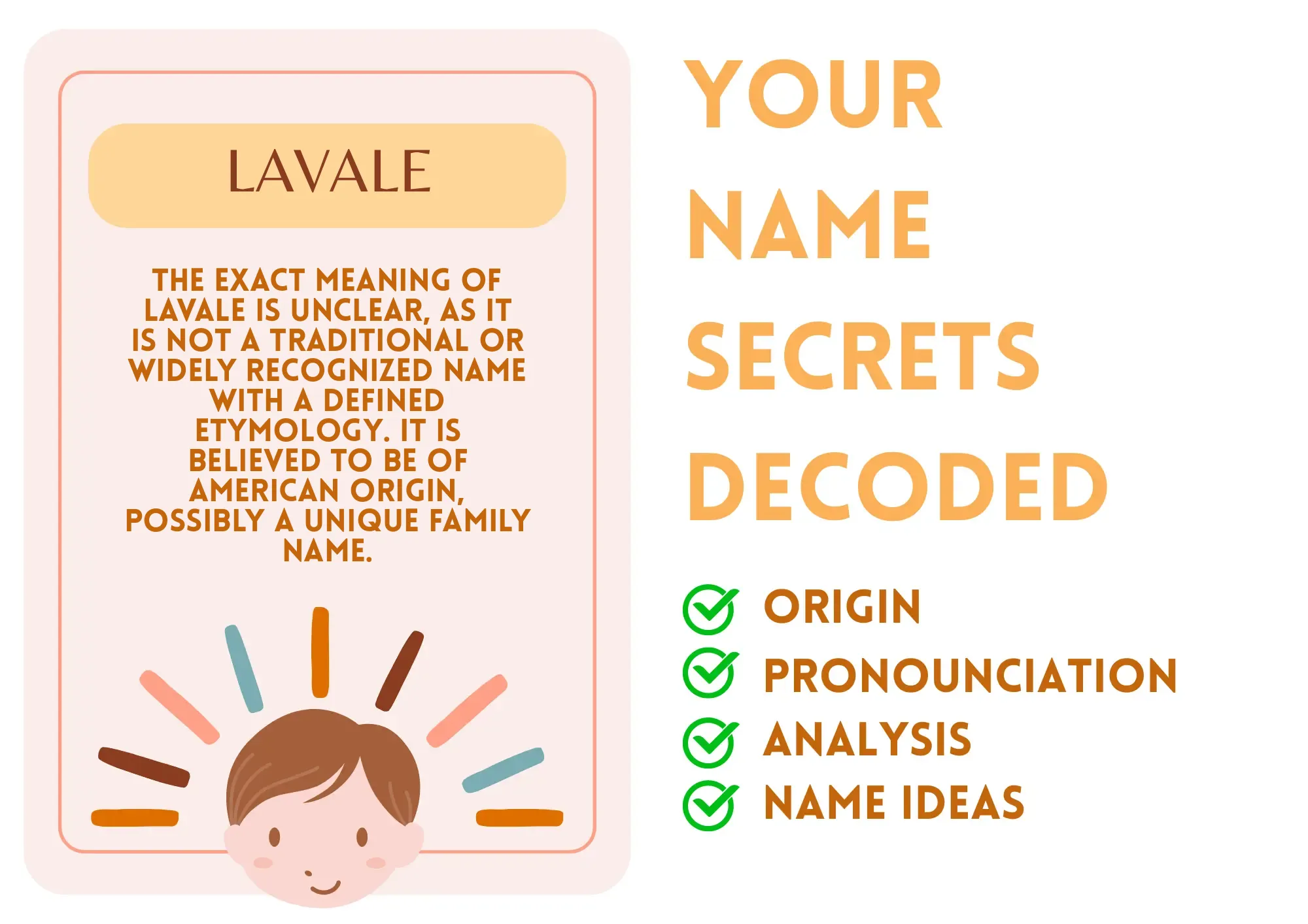 Meaning: The exact meaning of Lavale is unclear, as it is not a traditional or widely recognized name with a defined etymology. It is believed to be of American origin, possibly a unique family name.
