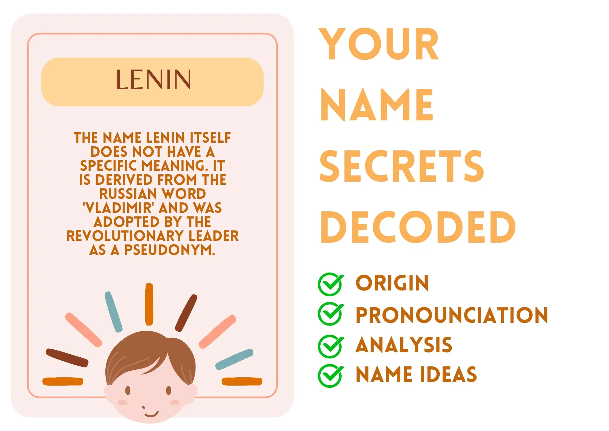 Meaning: The name Lenin itself does not have a specific meaning. It is derived from the Russian word 'Vladimir' and was adopted by the revolutionary leader as a pseudonym.