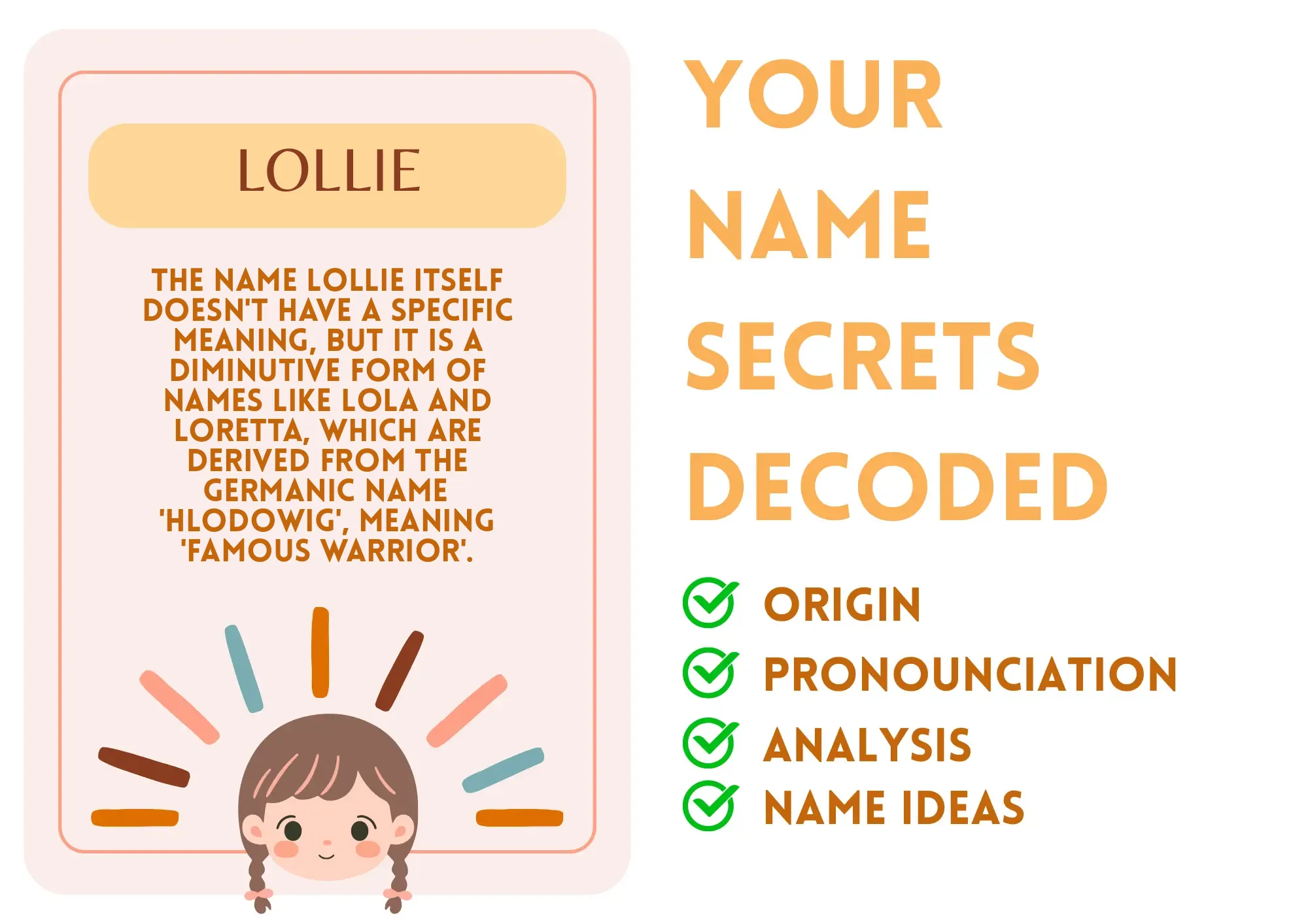 Meaning: The name Lollie itself doesn't have a specific meaning, but it is a diminutive form of names like Lola and Loretta, which are derived from the Germanic name 'Hlodowig', meaning 'famous warrior'.