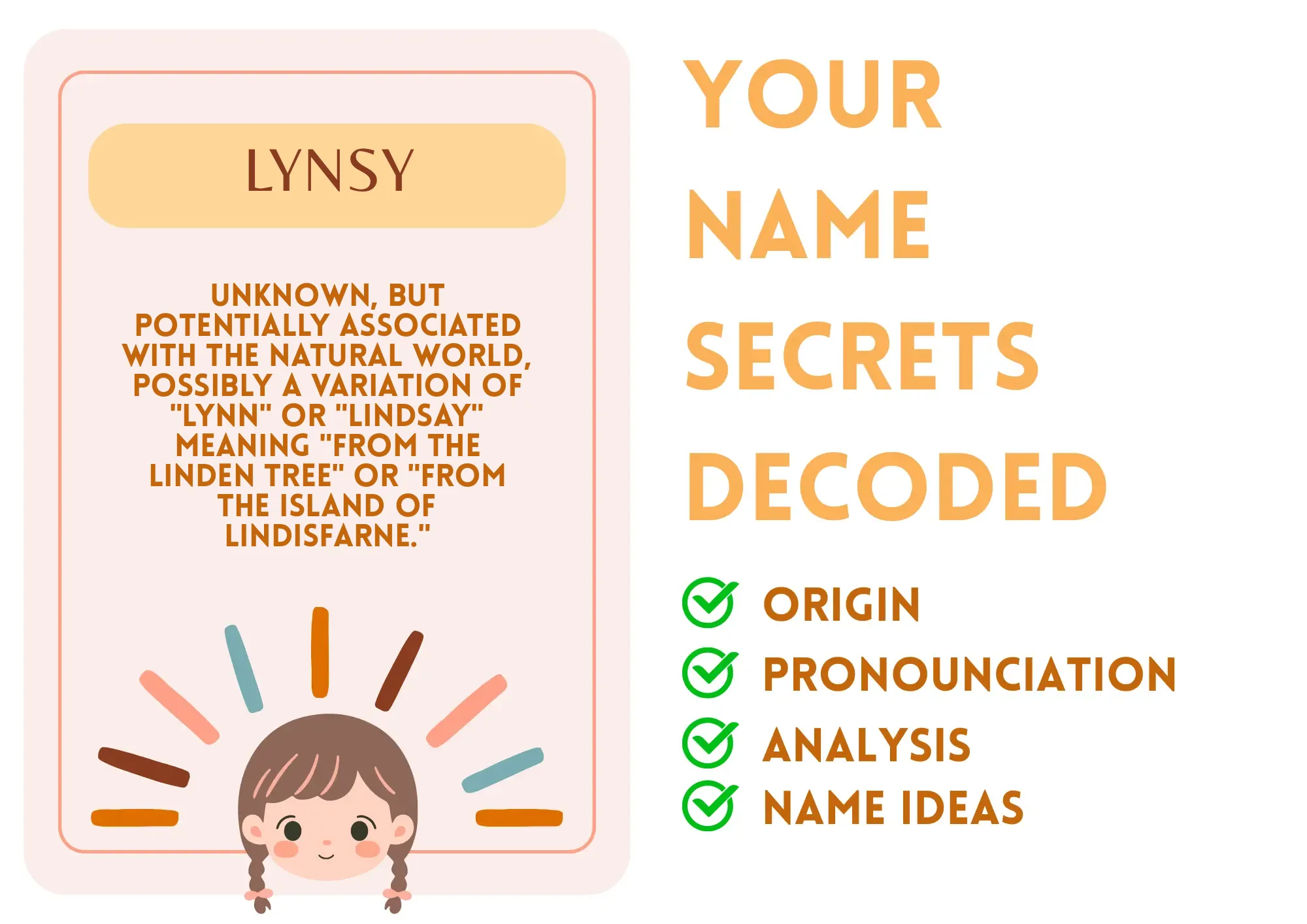 The name Lynsy is like a gentle breeze rustling through leaves—a nod to nature and all things calming. With a potential connection to the linden tree or an island’s serene waters, Lynsy has an innate ability to foster peace and harmony. Think of her as a nature-loving friend who brings you solace when life feels overwhelming. Whether it's decorating her room with plants or spending afternoons hiking in the woods, her appreciation for the natural world blooms in everything she does. And just like that tree, Lynsy stands firm but also sways gracefully with change, adapting to life’s challenges.