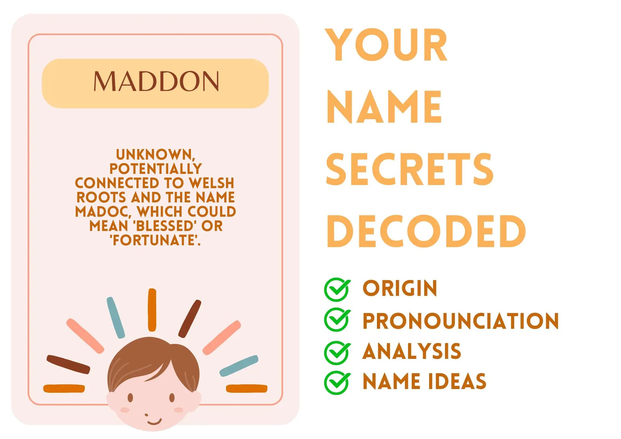 Origin: The origin of Maddon is uncertain, but it is likely of Welsh origin, possibly related to the name Madoc.